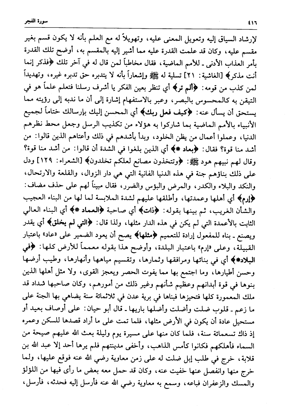 [ الغاشية : 21 ] تسلية له ( صلى الله عليه وسلم ) وإشعاراً بأنه لا يتدبره حق تدبره غيره ، وتهديداً لمن كذب من قومه : ( ألم تر ) أي تنظر بعين الفكر يا أشرف رسلنا فتعلم علماً هو في التيقن به كالمحسوس بالبصر ، وعبر بالاستفهام إشارة إلى أن ما ندبه إلى رؤيته مما يستحقأن يسأل عنه : ( كيف فعل ربك ) أي المحسن إليك بإرسالك ختاماً لجميع الأنبياء بالأمم الماضية بما شاركوا به هؤلاء من تكذيب الرسل وجعل محط نظرهم الدنيا ، وعملوا أعمال من يظن الخلود ، وبدأ بأشدهم في ذلك وأعتاهم الذين قالوا : من أشد منا قوة ؟ فقال : ( بعاد ) أي الذين بلغوا في الشدة أن قالوا : من أشد منا قوة ؟ وقال لهم نبيهم هود ( صلى الله عليه وسلم ) :