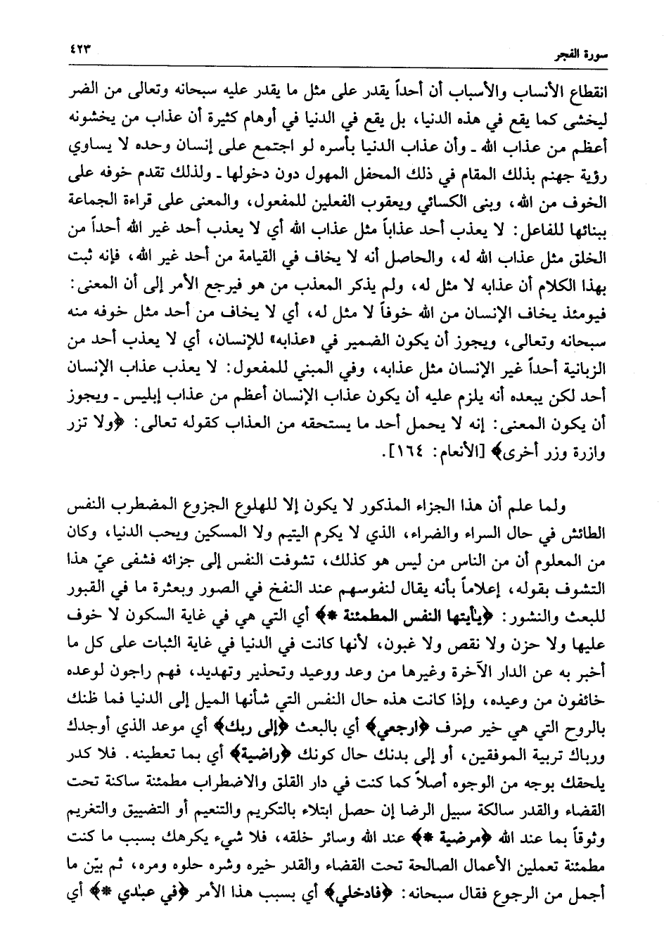 ولما علم أن هذا الجزاء المذكور لا يكون إلا للهلوع الجزوع المضطرب النفس الطائش في حال السراء والضراء ، الذي لا يكرم اليتيم ولا المسكين ويحب الدنيا ، وكان من المعلوم أن من الناس من ليس هو كذلك ، تشوفت النفس إلى جزائه فشفى عيّ هذا التشوف بقوله ، إعلاماً بأنه يقال لنفوسهم عند النفخ في الصور وبعثربة ما في القبول للبعث والنشور : ( يا أيتها النفس المطمئنة ) أي التي هي في غاية السكون لا خوف عليها ولا حزن ولا نقص ولا غبون ، لأنها كانت في الدنيا في غاية الثبات على كل ما أخبر به عن الدار الآخرة وغيرها من وعد ووعيد وتحذير وتهديد ، فهم راجون لوعده خائفون من وعيده ، وإذا كانت هذه حال النفس التي شأنها الميل إلى الدنيا فما ظنك بالروح التي تربية الموفقين ، أو إلى بدنك حال كونك ) راضية ) أي بما تعطينه .