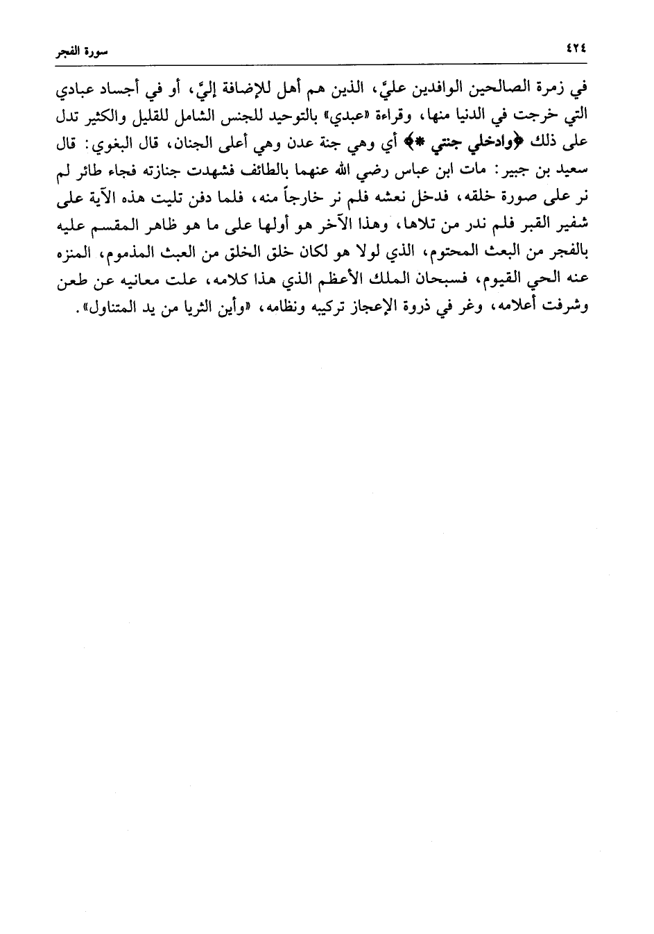 في زمرة الصالحين الوافدين عليَّ ، الذين هم أهل للإضافة إليَّ ، أو في أجساد عبادي التي خرجت في الدنيا منها ، وقراءة ( عبدي ) بالتوحيد للجنس الشامل للقليل والكثير تدل على ذلك ) وادخلي جنتي ) أي وهي جنة عدن وهي أعلى الجنان ، قال البغوي : قال سعيد بن بجير : مات ابن عباس رضي الله عنهما بالطائف فشهدت جنازته فجاء طائر لم نر على صورة خلقه ، فدخل نعشه فلم نر خارجاً منه ، فلما دفن تليت هذه الآية على شفير القبر فلم ندر من تلاها ، وهذا الآخر هو أولها على ما هو ظاهر المقسم عليه بالفجر من البعث المحتوم ، الذي لولا هو لكان خلق الخلق من العبث المذموم ، المنزه عنه الحي القيوم ، فسبحان الملك الأعظم الذي هذا كلامه ، علت معانيه عن طعن عنه الحي القيوم ، فسبحان الملك الأعظم الذي هذا كلامه ، علت معانيه عن طعن وشرفت أعلامه ، وغر في ذروة الإعجاز تركيبه ونظامه ، ( وأين الثريا من يد المتنازل ) .