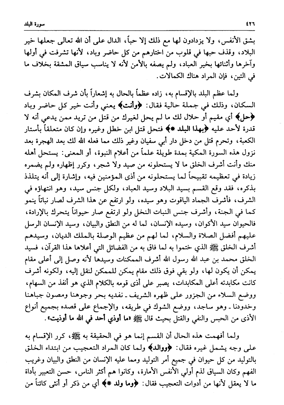 ولما عظم البلد بالإقسام به ، زاده عظماً بالحال به إشعاراً بأن شرف المكان بشرف السكان ، وذلك في جملة حالية فقال : ( وأنت ( يعني وأنت خير كل حاضر وباد ) حال ) أي مقيم أو حلال لك ما لم يحل لغيرك من قتل من تريد ممن يدعي أنه لا قدرة لأحد عليه ) بهذا البلد ( فتحل قتل ابن خطل وغيره وإن كان متعلقاً بأستار الكعبة ، وتحرم قتل من دخل دار أبي سفيان وغير ذلك ما فعله الله لك بعد الهجرة بعد نزول هذه السورة المكية بمدة طويله علماً من أعلام النبوة ، أو معنى : يستحل أهله منك وأنت أشرف الخلق ما لا يستحلونه من صيد ولا شجر ، وكرر إظهاره ولم يضمره زيادة في تعظيمه تقبيحاً لما يستحلونه من أذى المؤمنين فيه ، وإشارة إلى أنه يتلذذ بذكره ، فقد وقع القسم بسيد البلاد وسيد العباد ، ولكل جنس سيد ، وهو انتهاؤه في الشرف ، فأشرف الجماد الياقوت وهو سيده ، ولو ارتفع عن هذا الشرف لصار نباتاً ينمو كما في الجنة ، وأشرف جنس النبات النخل ولو ارتفع صار حيواناً يتحرك بالإرادة ، فالحيوان سيد الأكوان ، وسيده الإنسان ، لما له من النطق والبيان ، وسبد الإنسان الرسل عليهم أفضل الصلاة والسلام ، لما لهم من عظيم الوصلة بالملك الديان ، وسيدهم أشرف الخلق ( صلى الله عليه وسلم ) الذي ختموا به لما فاق به من الفضائل التي أعلاها هذا القرآن ، فسيد الخلق محمدم بن عبد الله رسول الله أشرف الممكنات وسيدها لأنه وصل إلى أعلى مقام يمكن أن يكون لها ، ولو بقي فوق ذلك مقام يمكن للممكن لنقل إليه ، ولكونه أشرف كانت مكابدته أعلى المكابدات ، يصبر على أذى قومه بالكلام الذي هو أنفذ من السهام ، ووضع السلاء من الجزور على ظهره الشريف - نفديه بحر وجوهنا ومصون جباهنا وخدودنا - وهو ساجد ، ووضع الشوك في طريقه ، والإجماع على قصده بجميع أنواع الأذى من الحبس والنفي والقتل بحيث قال ( صلى الله عليه وسلم ) ( ما أوذي أحد في الله ما أوذيت ) .
