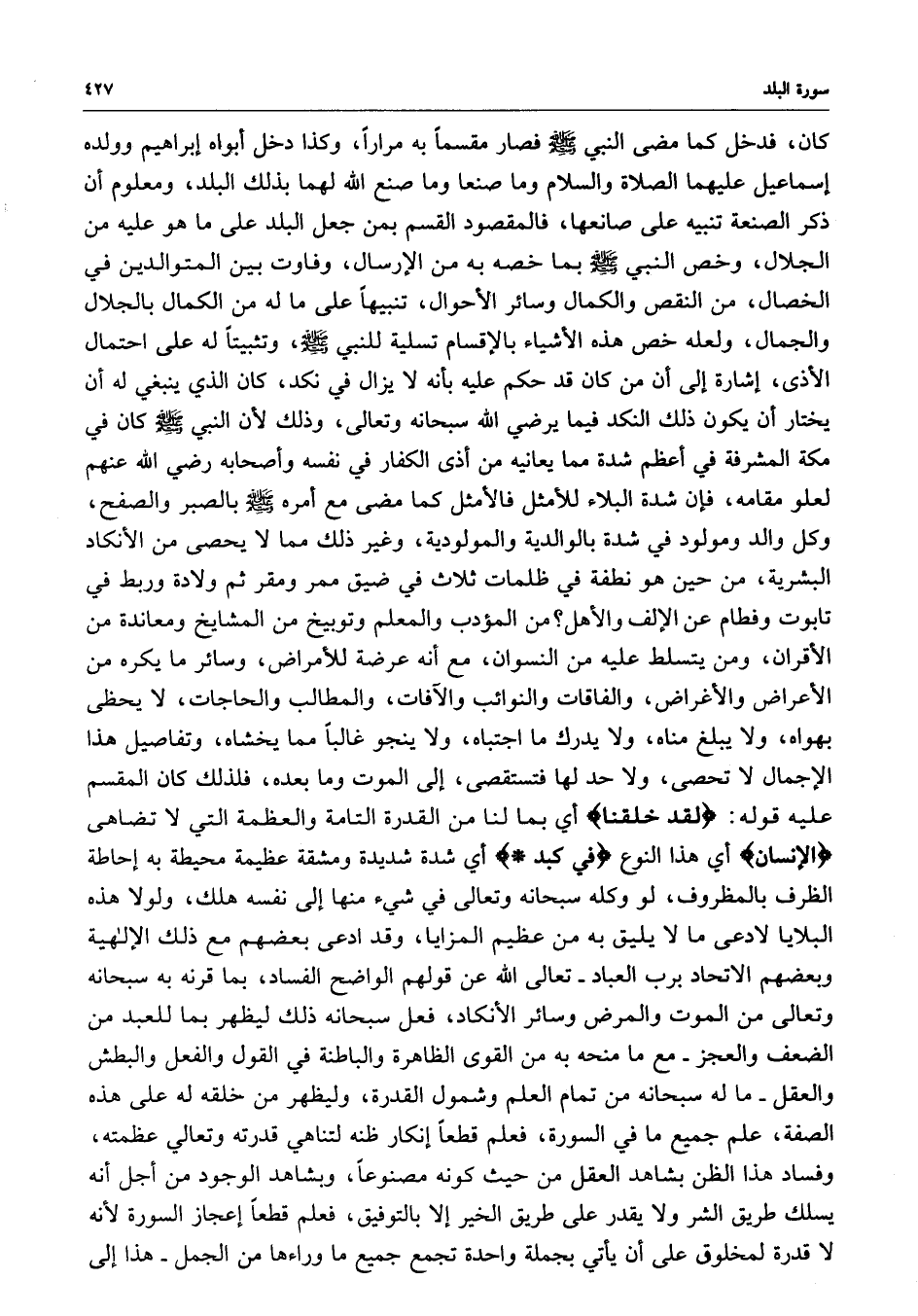 كان ، فدخل كما مضى النبي ( صلى الله عليه وسلم ) فصار مقسماً به مراراً ، وكذا دخل أبواه إبراهيم وولده إسماعيل عليهما الصلاة والسلام وما صنعا وما صنع الله لهما بذلك البلد ، ومعلوم أن ذكر الصنعة تنبيه على صانعها ، فالمقصود القسم بمن جعل البلد على ما هو عليه من الجلال ، وخص النبي ( صلى الله عليه وسلم ) بما خصه به من الإرسال ، وفاوت بين المتوالدين في الخصال ، ومن النقص والكمال وسائر الأحوال ، تنبيهاً على ما له من الكمال بالجلال والجمال ، ولعله خص هذه الأشياء بالإقسام تسلية للنبي ( صلى الله عليه وسلم ) ، وتثبيتاً له على احتمال الاذى ، إشارة إلى أن من كان قد حكم عليه بأنه لا يزال في نكد ، كان الذي ينبغي له أن يختار أن يكون ذلك النكد فيما يرضي الله سبحانه وتعالى ، وذلك لأن النبي ( صلى الله عليه وسلم ) كان في مكة المشرفة في أعظم شدة مما يعانيه من أذى الكفار في نفسه وأصحابه رضي الله عنهم لعلو مقامه ، فإن شدة البلاء للأمثل فالأمثل كما مضى مع أمره ( صلى الله عليه وسلم ) بالصبر والصفح ، وكل والد ومولود في شدة بالوالدية والمولودية ، وغير ذلك مما لا يحصى من الأنكاد البشرية ، من حين هو نطفة في ظلمات ثلاث في ضيق ممر ومقر ثم ولادة وربط في تابوت وفطام عن الإلف والأهل ؟ من المؤدب والمعلم وتوبيخ من المشايخ ومعاندة من الأقران ، ومن يتسلط عليه من النسوان ، مع أنه عرضة للأمراض ، وسائر ما يكره من الأعراض والإغراض ، والفاقات والنوائب والآفات ، والمطالب والحاجات ، لا يحظى بهواه ، ولا يبلغ مناه ، ولا يدرك ما اجتباه ، ولا ينجو غالباً مما يخشاه ، وتفاصيل هذا الإجمال لا تحصى ، ولا حد لها فتستقصى ، إلى الموت وما بعده ، فلذلك كان المقسم عليه قوله : ( لقد خلقنا ) أي بما لنا من القدرة التامة والعظمة التي لا تضاهى ) الإنسان ) أي هذا النوع ) في كبد ) أي شدة شديدة ومشقة عظيمة محيطة به إحاطة الظرف بالمظروف ، لو وكله سبحانه وتعالى في شيء منها إلىنفسه هلك ، ولوا هذه البلايا لا دعى ما لا يليق به من عظيم المزايا ، وقد ادعى بعضهم مع ذلك الإلهية وبعضهم الاتحاد برب العباد - تعالى الله عن قولهم الواضح الفساد ، بما قرنه به سبحانه وتعالى من الموت والمرض وسائر الأنكاد ، فعل سبحانه ذلك ليظهر بما للعبد من الضعف والعجز - مع ما منحه به من القوى الظاهرة والباطنة في القول والفعل والبطش والعقل - مع ما منحه به من القوى الظاهرة والباطنة في القول والفعل والبطش والعقل - ما له سبحانه من تمام العلم وشمول القدرة ، وليظهر من خلقه له على هذه الصفة ، على جميع ما في السورة ، فعلم قطعاً إنكار ظنه لتناهي قدرته وتعالي عظمته ، وفساد هذا الظن بشاهد العقل من حيث كونه مصنوعاً ، وبشاهد الوجود من أجل أنه يسلك طريق الشر ولا يقدر على طريق الخير إلا بالتوفيق ، فعلم قطعاً إعجاز السورة لأنه لا قدرة لمخلوق على أن يأتي بجملة واحدة تجمع جميع ما وراءها من الجمل - هذا إلى