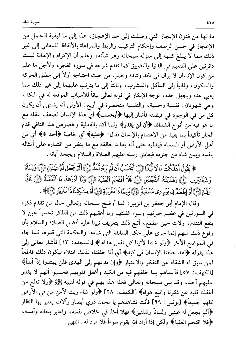) يَقُولُ أَهْلَكْتُ مَالاً لُّبَداً أَيَحْسَبُ أَن لَّمْ يَرَهُ أَحَدٌ أَلَمْ نَجْعَل لَّهُ عَيْنَيْنِ وَلِسَاناً وَشَفَتَيْنِ وَهَدَيْنَاهُ النَّجْدَينِ فَلاَ اقتَحَمَ الْعَقَبَةَ وَمَآ أَدْرَاكَ مَا الْعَقَبَةُ فَكُّ رَقَبَةٍ أَوْ إِطْعَامٌ فِي يَوْمٍ ذِي مَسْغَبَةٍ يَتِيماً ذَا مَقْرَبَةٍ أَوْ مِسْكِيناً ذَا مَتْرَبَةٍ ( ( )
