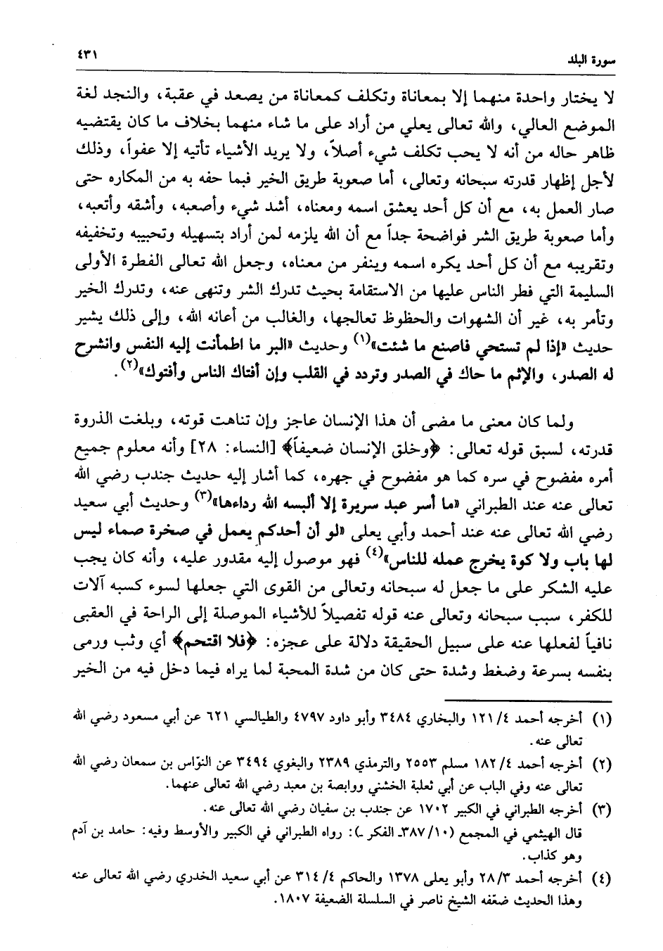 لا يختار واحدة منهما إلا بمعاناة وتكلف كمعاناة من يصعد في عقبة ، والنجد لغة الموضع العالي ، والله تعالى يعلي من أراد ما شاء منهما بخلاف ما كان يقتضيه ظاهر حاله من أنه لا يحب تكلف شيء أصلاً ، ولا يريد الأشياء تأتيه إلا عفواً ، وذلك لأجل إظهار قدرته سبحانه وتعالى ، أما صعوبة طريق الخير فبما حفه به من المكاره حتى صار العمل به ، مع أن كل أحد يعشق اسمه ومعناه ، أشد شيء وأصعبه ، وأشقه وأتعبه ، وأما صعوبة طريق الشر فواضحة جداً مع أن الله يلزمه لمن أراد بتسهيله وتحبيبه وتخفيفه وتقريبه مع أن كل أحد يكره اسمه وينفر من معناه ، وجعل الله تعالى الفطرة الأولى السليمة التي فطر الناس عليها من الاستقامة بحيث تدرك الشر وتنهى عنه ، وتدرك الخير وتأمر به ، غير أن الشهوات والحظوظ تعالجها ، والغالب من أعانه الله ، وإلى ذلك يشير حديث ( إذا لم تستحي فاصنع ما شئت ) وحديث ( البر ما اطمأنت إليه النفس وانشرح له الصدر ، والإثم ما حاك في الصدر وتردد في القلب وإن أفتاك الناس وأفتوك ) ولما كان معنى ما مضى أن هذا الإنسان عاجز وإن تناهت قوته ، وبلغت الذروة قدرته ، لسبق قوله تعالى :