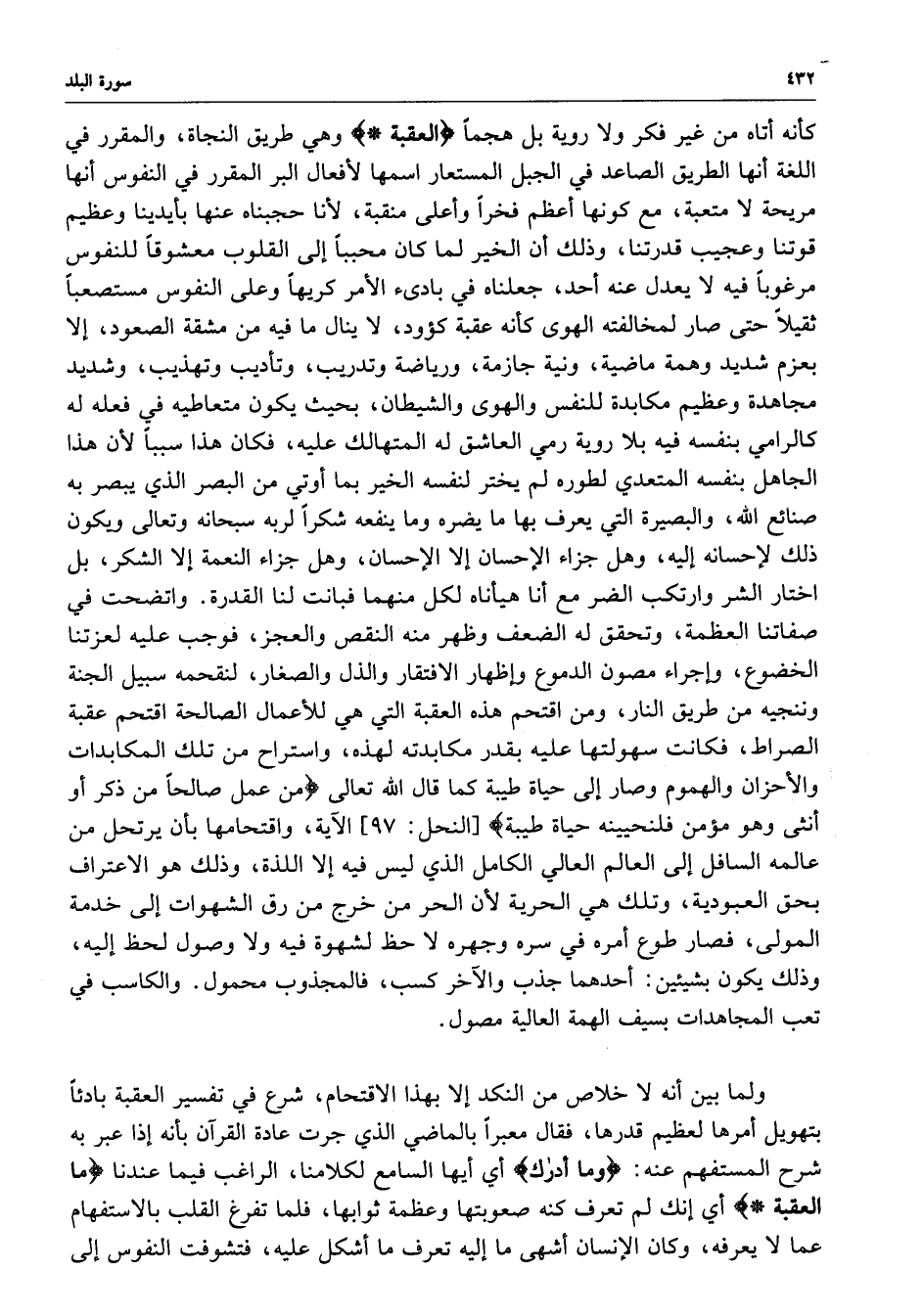 كأنه أتاه من غير فكر ولا روية بل هجماً ) العقبة ( وهي طريق النجاة ، والمقرر في اللغة أنها الطريق الصاعد في اجبل المستعار اسمها لأفعال البر المقرر في النفوس مريحة لا متعب ، مع كونها أعظم فخراً وأعلى منقبة ، لأنا حجبناه عنها بأيدينا وعظيم قوتنا وعجيب قدرتنا ، وذلك أن الخير لما كان محبباً إلى القلوب معشوقاً للنفوس مرغوباً فيه لا يعدل عنه أحد ، جعلناه في بادئ الأمر كريهاً وعلى النفوس مستصعباً ثقيلاً حتى صار لمخالفته الهوى كأنه عقبة كؤود ، لا ينال ما فيه من مشقة الصعود ، إلا بعزم شديد وهمة ماضية ، ونية جازمة ، ورياضة وتدريب ، وتأديب وتهذيب ، وشديد مجاهدة وعظيم مكابدة للنفس والهوى والشيطان ، بحيث يكون متعاطيه في فعله له كالرامي بنفسه المتعدي لطوره لم يختر لنفسه الخير بما أوتي من البصر الذي يبصر به صنائع الله ، والبصيرة التي يعرف بها ما يضره وما ينفعه شكراً لربه سبحانه وتعالى ويكون ذلك لإحسانه إليه ، وهل جزاء الإحسان إلا الإحسان ، وهل جزاء النعمة إلا الشكر ، بل اختار الشر وارتكب الضر مع أنا هيأناه لكل منهما فبانت لنا القدرة .