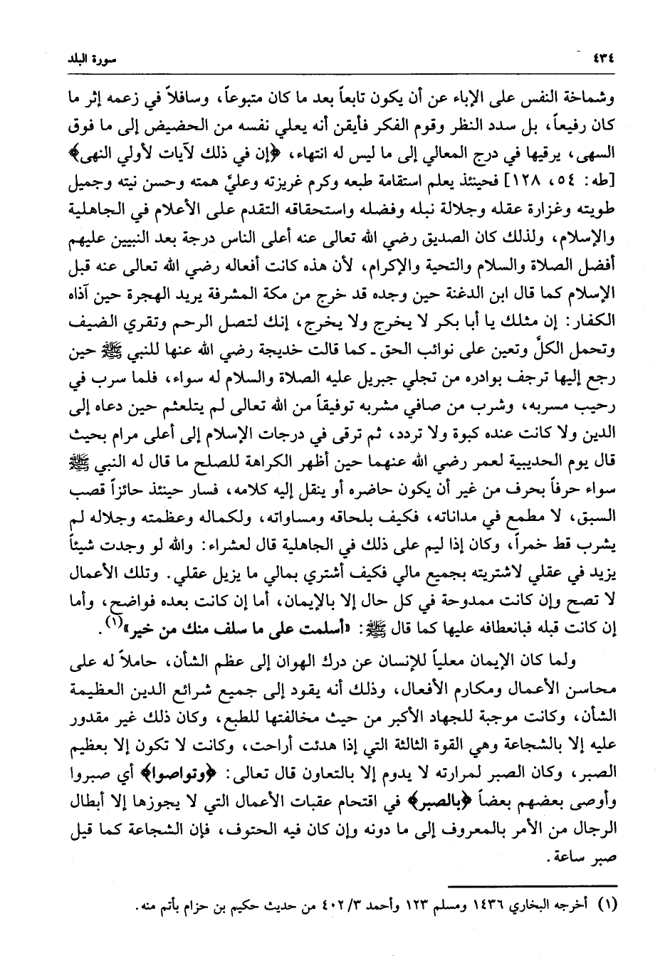 [ طه : 54 ، 128 ] فحينئذ يعلم استقامة طبعه وكرم غريزته وعليَّ همته وحسن نيته وجميل طويته وغزارة عقله وجلالة نبله وفضله واستحقاقه التقدم على الأعلام في الجاهلية والإسلام ، ولذلك كان الصديق رضي الله تعالى عنه أعلى الناس درجة بعد النبيين عليهم أفضل الصلاة والسلام والإكرام ، لأن هذه كانت أفعاله رضي الله تعالى عنه قبل الإسلام كما قال ابن الدغنة حين وجده قد خرج من مكة المشرفة يريد الهجرة حين آذاه الكفار : إن مثلك يا أبا بكر لا يخرج ولا يخرج ، إنك لتصل الرحم وتقري الضيف وتحمل الكلَّ وتعين على نوائب الحق - كما قالت خديجة رضي الله عنها للنبي ( صلى الله عليه وسلم ) حين رجع إليها ترجف بوادره من تجلي جبريل عليه الصلاة والسلام له سواء ، فلما سرب في رحيب مسربه ، وشرب من صافي مشربه توفيقاً من الله تعالى لم يتعلثم حين دعاه إلى الدين ولا كانت عنده كبوة ولا تردد ، ثم ترقى في درجات الإسلام إلى أعلى مرام بحيث قال يوم الحديبية لعمر رضي الله عنهما حين أظهر الكراهة للصلح ما قال له النبي ( صلى الله عليه وسلم ) سواء حرفاً بحرف من غير أن يكون حاضره أو ينقل إليه كلامه ، فسار حينئذ حائزاً قصب السبق ، لا مطمع في مداناته ، فكيف بلحاقه ومساواته ، ولكماله وعظمته وجلاله لم يشرب قط خمراً ، وكان إذا ليم على ذلك في الجاهلية قال لعشراء : والله لو وجدت شيئاً يزيد في عقلي لاشتريته بجميع مالي فكيف أشتري بمالي ما يزيل عقلي .