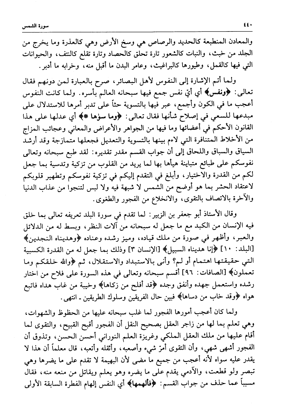 [ الصافات : 96 ] أقسم سبحانه وتعالى في هذ هالسورة على فلاح من اختيار رشده واستعمل جهده وأنفق وجده ) قلد أفلح من زكاها ( وخيبة من غاب هداه فاتبع هواه ) وقد خاب من دساها ( فبين حال الفريقين وسلوك الطريقين - انتهى .