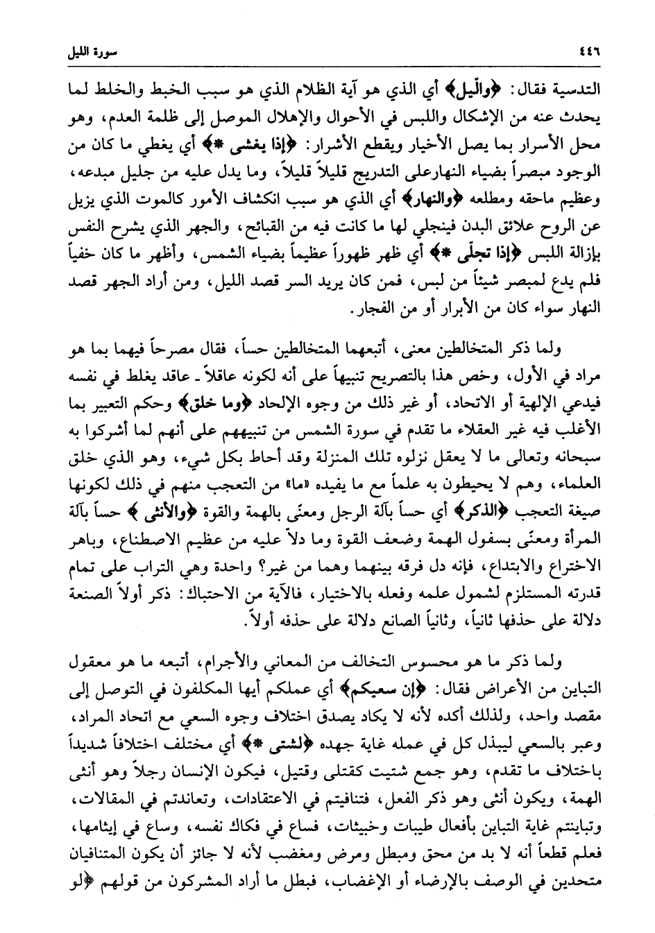 التدسية فقال : ( والّيل ) أي الذي هو آية الظلام الذي هو سبب الخبط والخلط لما يحدث عنه من الإشكال واللبس في الأحوال والإهلال الموصل إلى ظلمة العدم ، وهو محل الأسرار بما يصل الأخيار ويقطع الأشرار : ( إذا يغشى ) أي يغطي ما كان من الوجود مبصراً بضياء النهار على التدريج قليلاً قليلاً ، وما يدل عليه من جليل مبدعه ، وعظيم ما حقه ومطلعه ) والنهار ) أي الذي هو سبب انكشاف الأمور كالموت الذي يزيل عن الروح علائق البدن فينجلي لها ما كانت فيه من القبائح ، والجهر الذي يشرح النفس بإزالة اللبس ) إذا تجلّى ) أي ظهر ظهوراً عظيماً بضياء الشمس ، وأظهر ما كان خفياً فلم يدع لمبصر شيئاً من لبس ، فمن كان يريد السر قصد الليل ، ومن أراد الجهر قصد النهار سواء كان من الأبرار أو من الفجار .