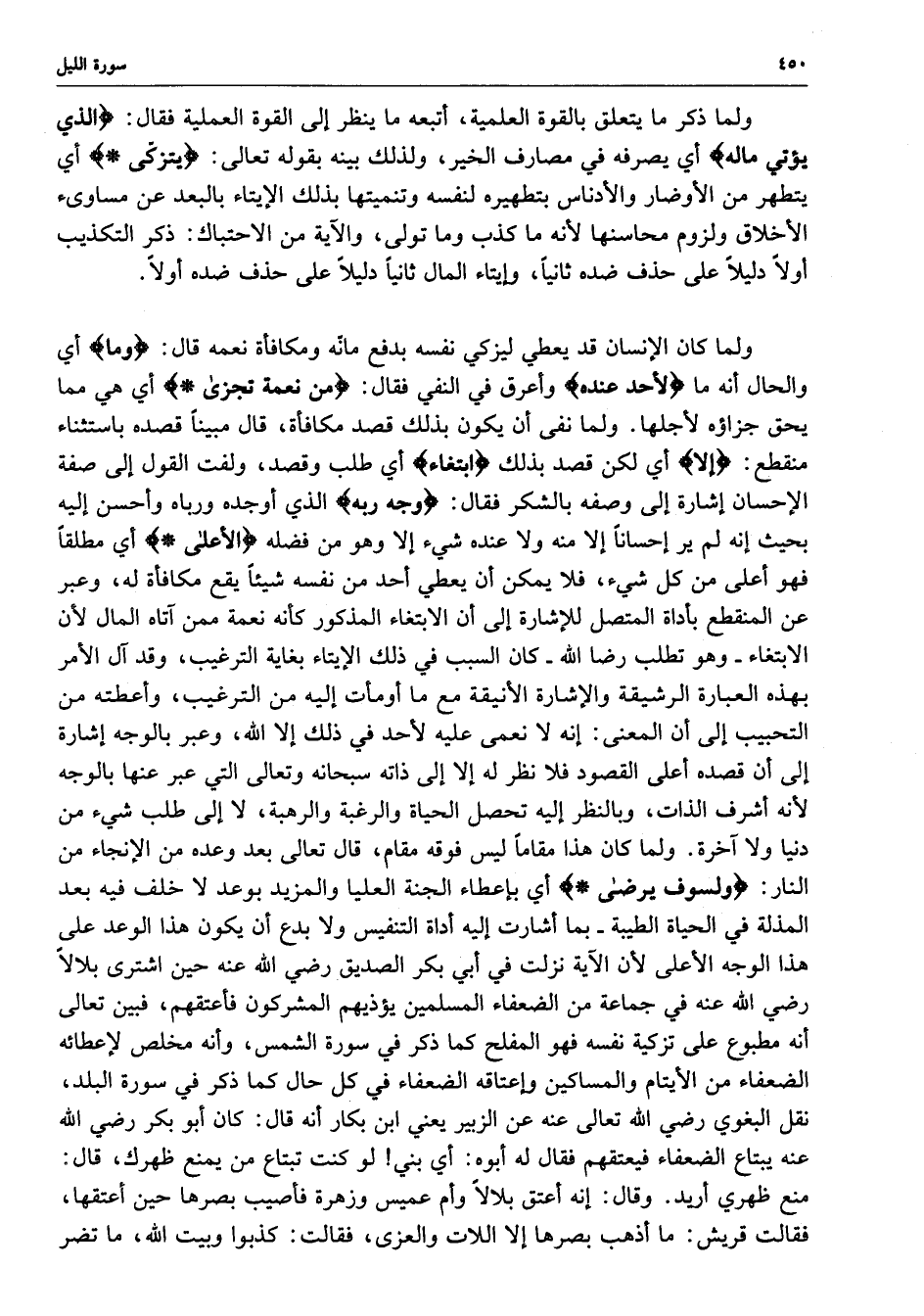 ولما كان هذا مقاماً ليس فوقه مقام ، قال تعالى بعد وعده من الإنجاء من النار : ( ولسوف يرضى ) أي بإعطاء الجنة العليا والمزيد بوعد لا خلف فيه بعد المذلة في الحياة الطيبة - بما أشارت إليه أداة التنفيس ولا بدع أن يكون هذا الوعد على هذا الوجه الأعلى لأن الآية نزلت في أبي بكر الصديق رضي الله عنه حين اشترى بلالاً رضي الله عنه في جماعة من الضعفاء المسلمين يؤذيهم المشركون فأعتقهم ، فبين تعالى أنه مطبوع على تزكية نفسه فهو المفلح كما ذكر في سورة الشمس ، وأنه مخلص لإعطائه الضعفاء من الأيتام والمساكين وإعتاقه الضعفاء في كل حال كما ذكر في سورة البلد ، نقل البغوي رضي الله تعالى عنه عن الزبير يعني ابن بكاري أنه قال : كان أبو بكر رضي الله عنه يبتاع الضعفاء فيعتقهم فقال له أبوه : أي بني لو كنت تبتاع من يمنع ظهرك ، قال : منع ظهري أريد .