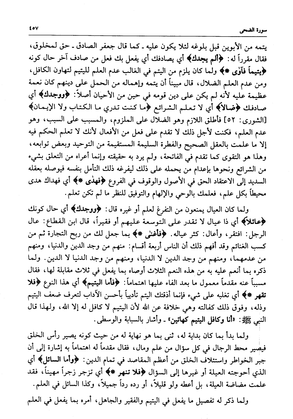 ولما ذكره بما أنعم عليه به من هذه النعم الثلاث أوصاه بما يفعل في ثلاث مقابلة لها ، فقال مسبباً عنه مقدماً معمول ما بعد الفاء عليها اهتماماً : ( فأما اليتيم ) أي هذا النوع ) فلا تقهر ) أي تغلبه على شيء فإنما أذقتك اليتم تأديباً بأحسن الآداب لتعرف ضعف اليتيم وذله ، وفوق ذلك كفالته وهي خلافة عن الله لأن اليتيم لا كافل له إلا الله ، ولهذا قال النبي ( صلى الله عليه وسلم ) : ( أنا وكافل اليتيم كهاتين ) - وأشار بالسبابة والوسطى .