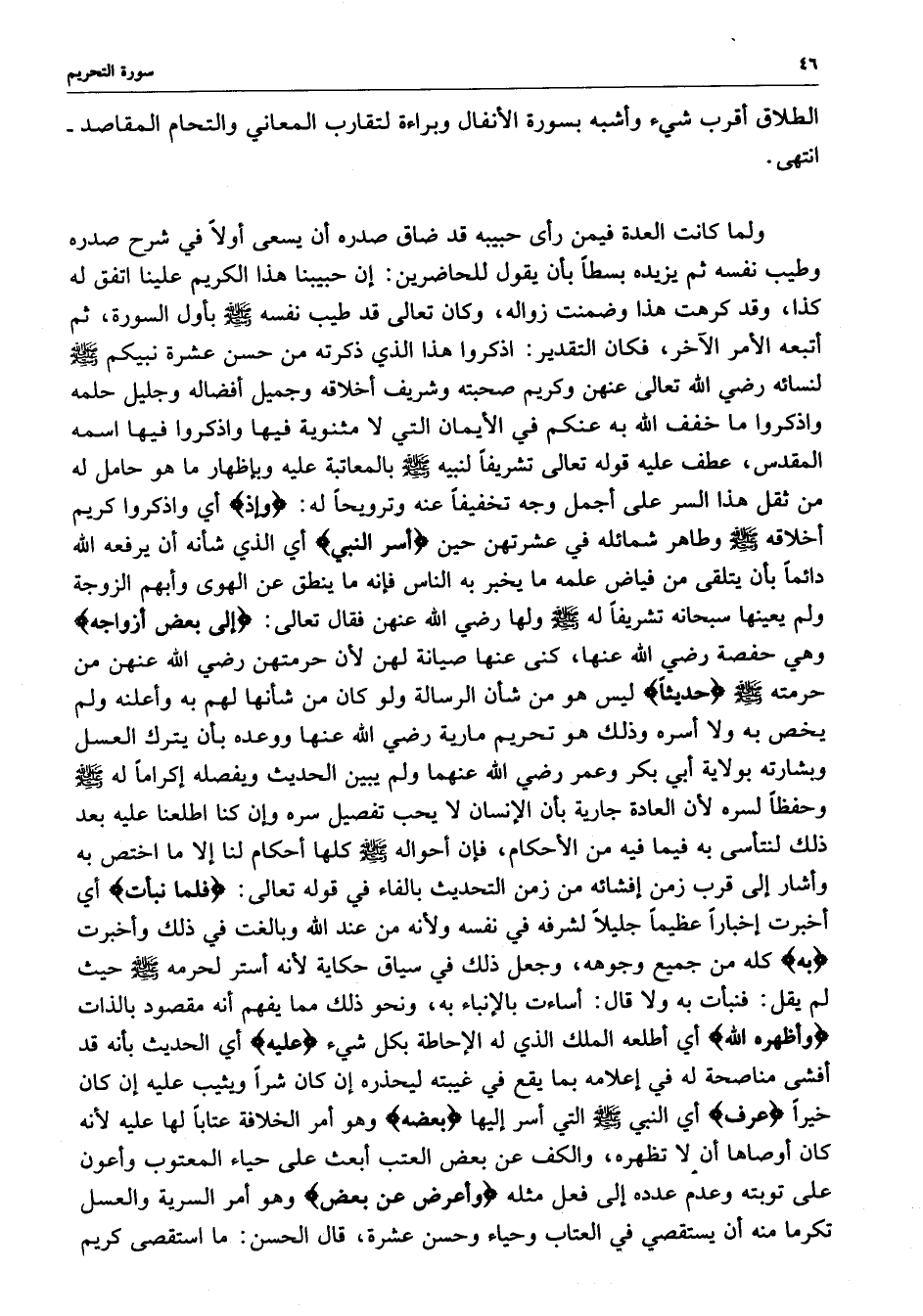 ولما كانت العدة فيمن رأى حبيبه قد ضاق صدره أن يسعى أولاً في شرح صدره وطيب نفسه ثم يزيده بسطاً بأن يقول للحاضرين : إن حبيبنا هذا الكريم علينا اتفق له كذا ، وقد كرهت هذا وضمنت زواله ، وكان تعالى قد طيب نفسه ( صلى الله عليه وسلم ) بأول السورة ، ثم أتبعه الأمر الآخر ، فكان التقدير : اذكروا هذا الذي ذكرته من حسن عشرة نبيكم ( صلى الله عليه وسلم ) لنسائه رضي الله تعالى عنهن وكريم صحبته وشريف أخلاقه وجميل أفضاله وجليل حلمه واذكروا ما خفف الله به عنكم في الأيمان التي لا مثنوية فيها واذكروا فيها اسمه المقدس ، عطف عليه قوله تعالى تشريفاً لنبيه ( صلى الله عليه وسلم ) بالمعاتبة عليه وبإظهار ما هو حامل له نم ثقل هذا السر على أجمل وجه تخفيفاً عنه وترويحاً له : ( أسر النبي ) أي الذي شأنه أن يرفعه الله دائماً بأن يتلقى من فياض علمه ما يخبر به الناس فإنه ما ينطق عن الهوى وأبهم الزوجة وهي حفصة رضي الله عنها ، كنى عنها صيانة لهن لأن حرمتهن رضي الله عنهن من حرمته ( صلى الله عليه وسلم ) ) حديثاً ( ليس هو من شأن الرسالة ولو كان من شأنها لهم به وأعلنه لم يخص بهولا أسره وذلك هو تحريم مارية رضي الله عنها ووعده بأن يترك العسل وبشارته بولاية أبي بكر وعمر رضي الله عنهما ولم يبين الحديث ويفصله إكراماً له ( صلى الله عليه وسلم ) وحفظاً لسره لأن العادة جارية بأن الإنسان لا يحب تفصيل سره وإن كنا اطلعنا عليه بعد ذلك لنتأسى به فيما فيه من الأحكام ، فإن أحواله ( صلى الله عليه وسلم ) كلها أحكام لنا إلا ما اختص به وأشار إلى قرب زمن إفشائه من زمن التحديث بالفاء في قوله تعالى : ( فلما نبأت ) أي أخبرت إخباراً عظيماً جليلاً لشرفه في نفسه ولأنه من عند الله وبالغت في ذلك وأخبرت ) به ( كله من جميع وجوهه ، وجعل ذلك في سياق حكاية لأنه أستر لحرمه ( صلى الله عليه وسلم ) حيث لم يقل : فنبأت به ولا قال : أساءت بالإنباء به ، ونحو ذلك مما يفهم أنه مقصود بالذات ) وأظهره الله ) أي أطلعه الملك الذي له الإحاطة بكل شيء ) عليه ) أي الحديث بأنه قد أفشى مناصحة له في إعلامه بما يقع في غيبته ليحذره إن كان شراً ويثيب عليه إن كان خيراً ) عرف ) أي النبي ( صلى الله عليه وسلم ) التي أسر إليها ) بعضه ( وهو أمر الخلافة عتاباً لها عليه لأنه كان أوصاها أن لا تظهره ، والكف عن بعض العتب أبعث على حياء المعتوب وأعون على توبته وعدم عدده إلى فعل مثله ) وأعرض عن بعض ( وهو أمر السرية والعسل تكرما منه أن يستقصي في العتاب وحياء وحسن عشرة ، قال الحسن : ما استقصى كريم