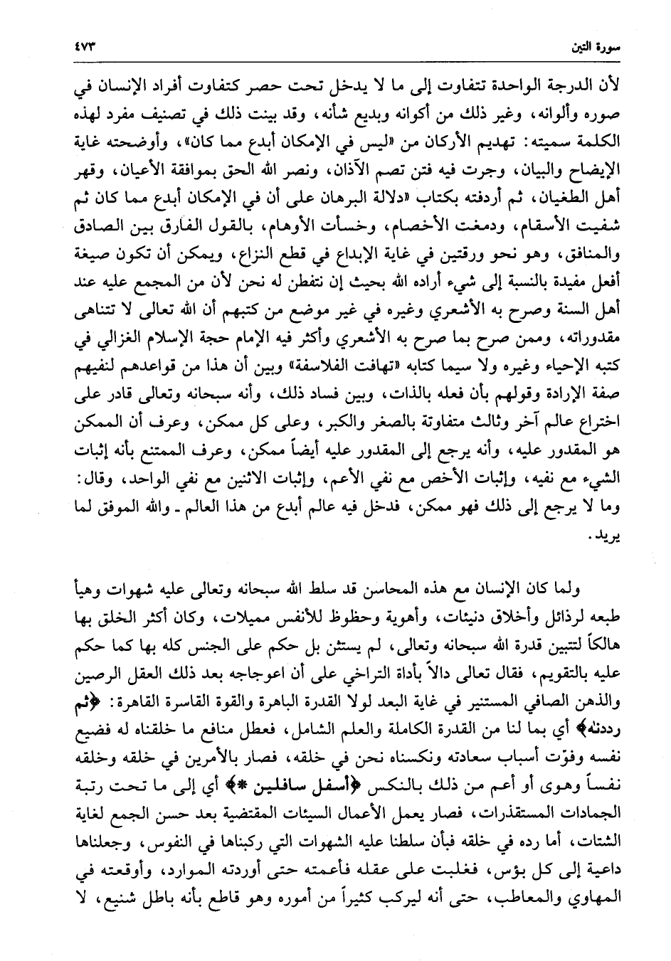 ولما كان الإنسان مع هذه المحاسن قد سلط الله سبحانه وتعالى عليه شهوات وهيأ طبعه لرذائل وأخلاق دنيئات ، وأهوية وحظوظ للأنفس مميلات ، وكان أكثر الخلق بها هالكاً لتتبين قدرة الله سبحانه وتعالى ، لم يستثن بل حكم على الجنس كله بها كما حكم عليه بالتقويم ، فقال تعالى دالاً بأداة التراخي على أن اعوجاجه بعد ذلك العقل الرصين والذهن الصافي المستنير في غاية البعد لولا القدرة الباهرة والقوة القاسرة القاهرة : ( ثم رددناه ) أي بما لنا من القدرة الكاملة والعلم الشامل ، فعطل منافع ما خلقناه له فضيع نفسه وفوّت أساب سعادته ونكسناه نحن في خلقه ، فصار بالأمرين في خلقه وخلقه نفساً وهوى أو أعم من ذلك بالنكس ) أسفل سافلين ) أي إلى ما تحت رتبة الجمادات المستقذرات ، فصار يعمل الأعمال السيئات المقتضية بعد حسن الجمع لغاية الشتات ، أما رده في خلقه فبأن سلطنا عليه الشهوات التي ركبناها في النفوس ، وجعلناها داعية إلى كل بؤس ، فغلبت على عقله فأعمته حتى أوردته الموارد ، وأوقعته في المهاوي والمعاطب ، حتى أنه ليركب كثير من أموره وهو قاطع بأنه باطل شنيع ، لا
