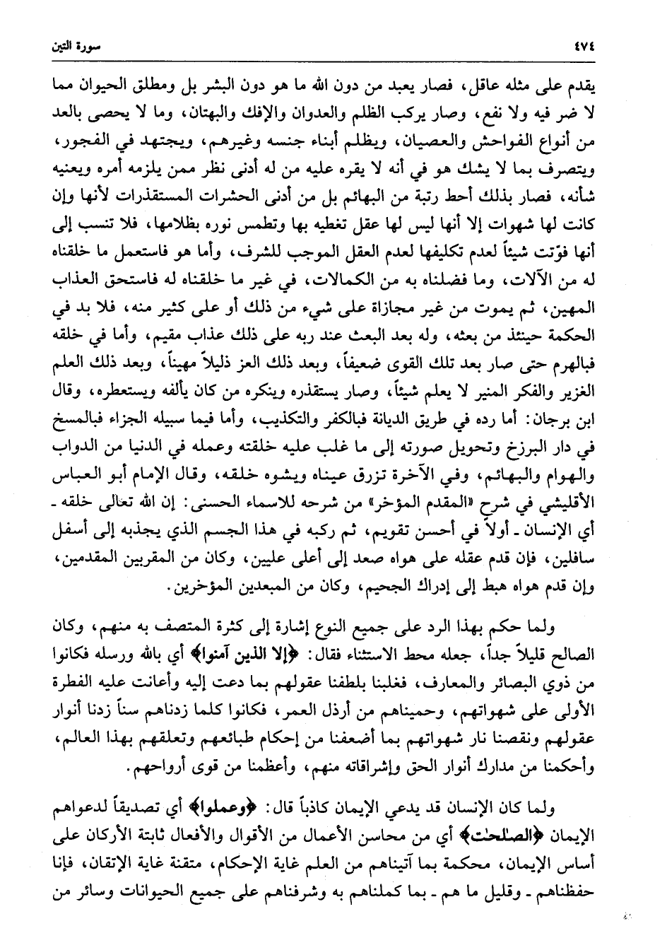 يقدم على مثله عاقل ، فصار يعبد من دون الله ما هو دون البشر بل ومطلق الحيوان مما لا ضر فيه ولا نفع ، وصار يركب الظلم والعدوان والإفك والبهتان ، وما لا يحصبى بالعد من أنواع الفواحش والعصيان ، ويظلم أبناء حنسه وغيرهم ، ويجتهد في الفجور ، ويتصرف بما لا يشك هو في أنه لا يقره عليه من له أدنى نظر ممن يلزمه أمره ويعنيه شأنه ، فصار بذلك أحط رتبة من البهائم بل من أدنى الحشرات المستقذرات لأنها وإن كانت لها شهوات إلا أنها ليس لها عقل تغطيه بها وتطمس نوره بظلامها ، فلا تنسب إلى أنها فوّتت شيئاً لعدم تكليفها لعدم العقل الموجب للشرف ، وأما هو فاستعمل ما خلقناه له من الآلات ، وما فضلناه به من الكمالات ، في غير ما خلقناه له فاستحق العذاب المهين ، ثم يموت من غير مجازاة على شيء من ذلك أو على كثير منه ، فلا بد في الحكمة حينئذ من بعثه ، وله بعد البعث عند ربه على ذلك عذاب مقيم ، وأما في خلقه فبالهرم حتى صار بعد تلك القوى ضعيفاً ، وبعد ذلك العز ذليلاً مهيناً ، وبعد ذلك العلم الغزير والفكر المنير لا يعلم شيئاً ، وصار يستقذره وينكره من كان يألفه ويستعطره ، وقال ابن برجان : أما رده في طريق الديانة فبالكفر والتكذيب ، وأما فيما سبيله الجزاء فبالمسخ في دار البرزخ وتحويل صورته إلى ما غلب عليه خلقته وعمله في الدنيا من الدواب والهوام والبهائم ، وفي الآخرة تزرق عيناه ويشوه خلقه ، وقال الإمام أبو العباس الأقليشي في شرح ( المقدم المؤخر ) من شرحه للاسماء الحسنى : إن الله تعالى خلقه .