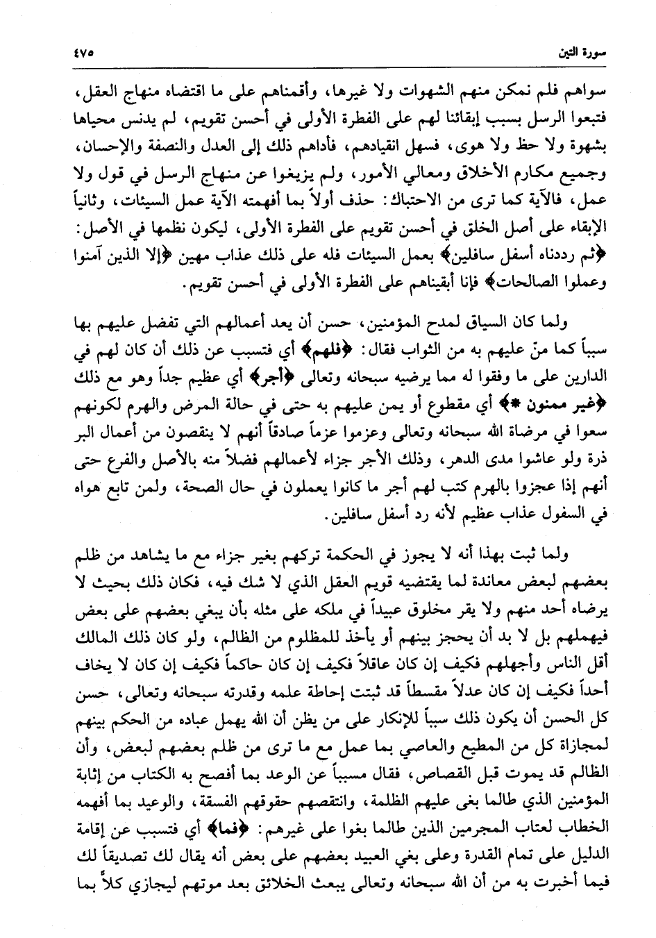 سواهم فلم نمكن منهم الشهوات ولا غيرها ، وأقمناهم على ما اقتضاه منهاج العقل ، فتبعوا لارسل بسبب إبقائنا لهم على الفطرة الأولى في أحسن تقويم ، لم يدنس محياها بشهوة ولا حظ ولا هوى ، فسهل انقيادهم ، فأداهم ذلك إلى العدل والنصف والإحسان ، وجميع مكارم الأخلاق ومعالي الأمور ، ولم يزيغوا عن منهاج الرسل في قول ولا عمل ، فالآية كما ترى من الاحتباك : حذف أولاً بما أفهمته الآية عمل السيئات ، وثانياً الإبقاء على أصل الخلق في أحسن تقويم على الفطرة الأولى ، ليكون نظمها في الأصل ) ثم رددناه أسفل سافلين ( بعمل السيئات فله على ذلك عذاب مهين ) إلا الذين آمنوا وعملوا الصالحات ( فإنا أبقيناهم على الفطرة الأولى في أحسن تقويم .