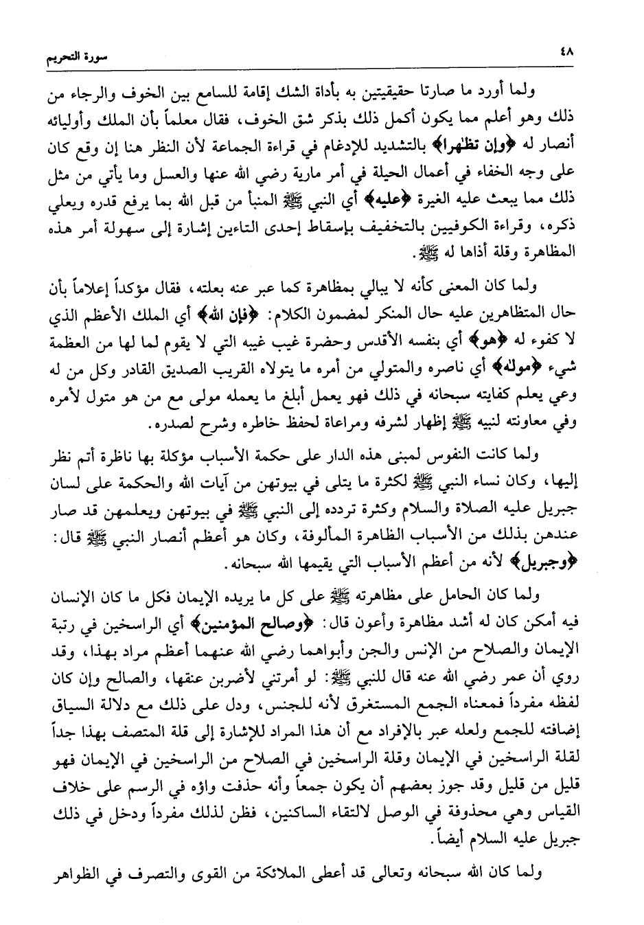 ولما أورد ما صارتا حقيقيتين به بأداة الشك إقامة للسامع بين الخوف والرجاء من ذلك وهو أعلم مام يكون أكمل ذلك بذكر شق الخوف ، فقال معلماً بأن الملك وأوليائه أنصار له ) وغن تظاهرا ( بالتشديد للإدغام في قراءة الجماعة لأن النظر هنا إن وقع كان على وجه الخفاء في أعمال الحيلة في أمر مارية رضي الله عنها والعسل وما يأتي من مثل ذلك ما يبعث عليه الغيرة ) عليه ) أي النبي ( صلى الله عليه وسلم ) المنبأ من قبل الله بما يرفع قدره ويعلي ذكره ، وقراءة الكوفيين بالتخفيف بإسقاط إحدى التاءين إشارة إلى سهولة أمر هذه المظاهرة وقلة أذاها له ( صلى الله عليه وسلم ) .
