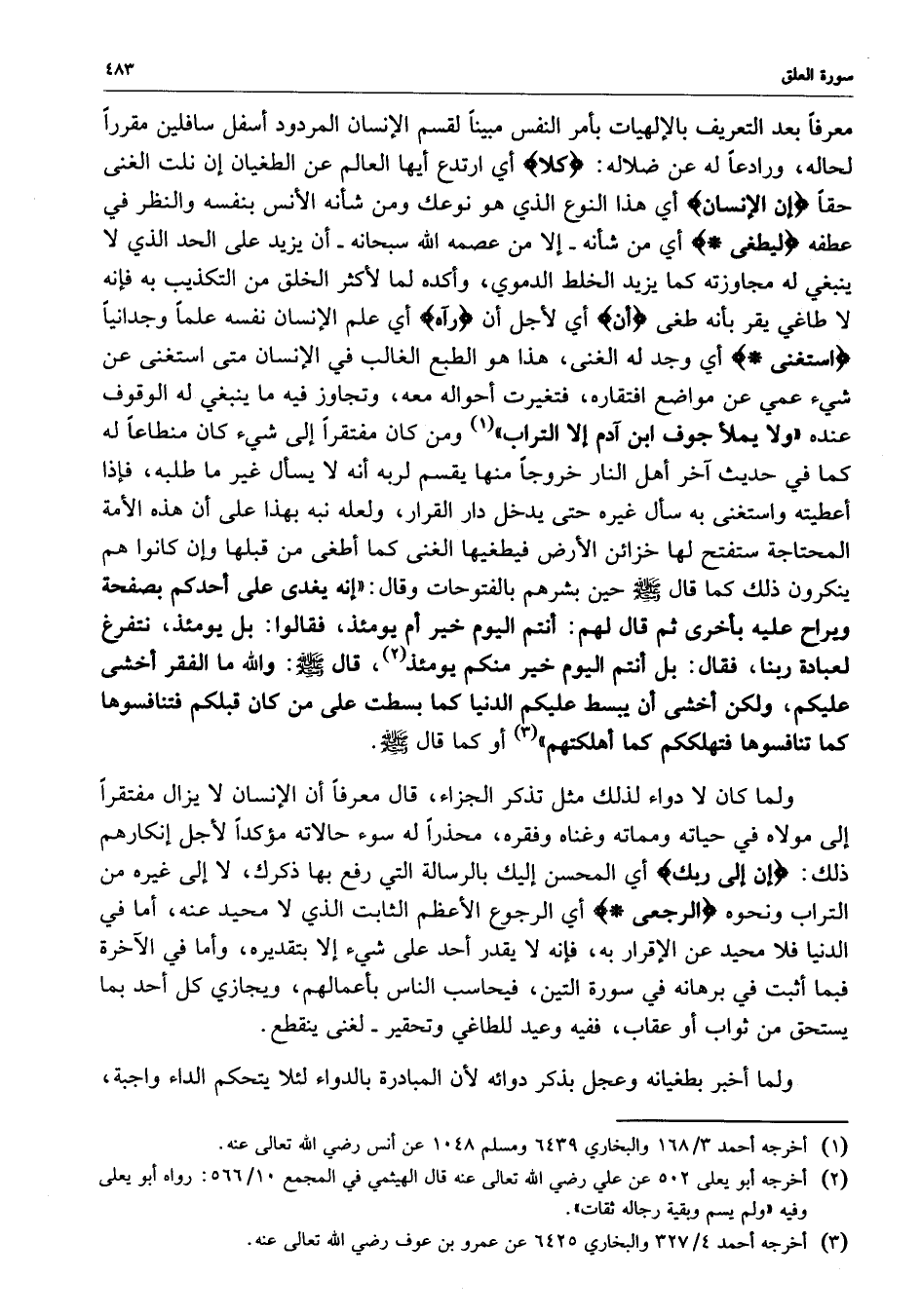 معرفاً بعد التعريف بالإلهيات بأمر النفس مبيناً لقسم الإنسان المردود أسفل سافلين مقرراً لحاله ، ورادعاً له عن ضلاله : ( كلا ) أي ارتدع أيها العالم عن الطغيان إن نلت الغنى حقاً ) إن الإنسان ) أي هذا النوع الذي هو نوعك ومن شأنه الأنس بنفسه والنظر في عطفه ) ليطغى ) أي من شأنه - إلا من عصمه الله سبحانه - أن يزيد على الحد الذي لا ينبغي له مجاوزته كما يزيد الخلط الدموي ، وأكده لما لأكثر الخلق من التكذيب به فإنه لا طاغي يقر بأنه طغى ) أن ) أي لأجل أن ) رآه ) أي علم الإنسان نفسه علماً وجدانياً ) استغنى ) أي وجد له الغنى ، هذا هو الطبع الغالب في الإنسان متى استغنى عن شيء عمي عن مواضع افتقاره ، فتغيرت أحواله معه ، وتجاوز فيه ما ينبغي له الوقوف عنده ( ولا يملأ جوف ابن آدم إلا التراب ) ومن كان مفتقراً إلى شيء كان منطاعاً له كما في حديث آخر أهل النار خروجاً منها يقسم لربه أنه لا يسأل غير ما طلبه ، فإذا أعطيته واستغنى به سأل غيره حتى يدخل دار القرار ، ولعله نبه بهذا على أن هذه الأمة المحتاجة ستفتح لها خزائن الأرض فيطغيها الغنى كما أطغى من قبلها وإن كانوا هم ينكرون ذلك كما قال ( صلى الله عليه وسلم ) حين بشرهم بالفتوحات وقال : ( إنه يغدى على أحدكم بصفحة ويراح عليه بأخرى ثم قال لهم : أنتم اليوم خير من يومئذ ، فقالوا : بل يومئذ ، نتفرغ لعبادة ربنا ، فقال : بل أنتم اليوم خير منكم يومئذ ، قال ( صلى الله عليه وسلم ) : والله ما الفقر أخشى عليكم ، ولكن أخسى أن يبسط عليكم الدنيا كما بسطت على من كان قبلكم فتنافسوها كما تنافسوها فتهلككم كما أهلكتهم ) أو كما قال ( صلى الله عليه وسلم ) .