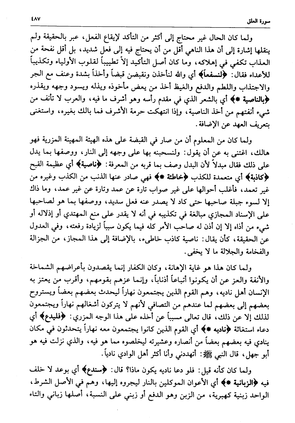 ولما كان الحال غير محتاج إلى أكثر من التأكذ لإيقاع الفعل ، عبر بالحقيقة ولم ينقلها إشارة إلى أن هذا الناهي أقل منأن يحتاج فيه غلى فعل شديد ، بل أقل نفحة من العذاب تكفي في إهلاكه ، وما كان أصل التأكيد إلاّ تطيبباً لقلوب الأولياء وتكذيباً للأعداء فقال : ( لنسفعاً ) أي والله لنأخذن ونقبضن قبضاً وأخذاً بشدة وعنف مع الجر والاجتذاب واللطم والدفع والغيظ أخذ من يعض مأخوذه ويذله ويسود وجهه ويقذره ) بالناصية ) أي بالشعر الذي في مقدم رأسه وهو أشرف ما فيه ، والعرب لا تأنفس من شيء أنفتهم من أخذ الناصية ، وإذا انتهكت حرمة الأشرف فما بالك بغيره ، واستغنى بتعريف العهد عن الإضافة .