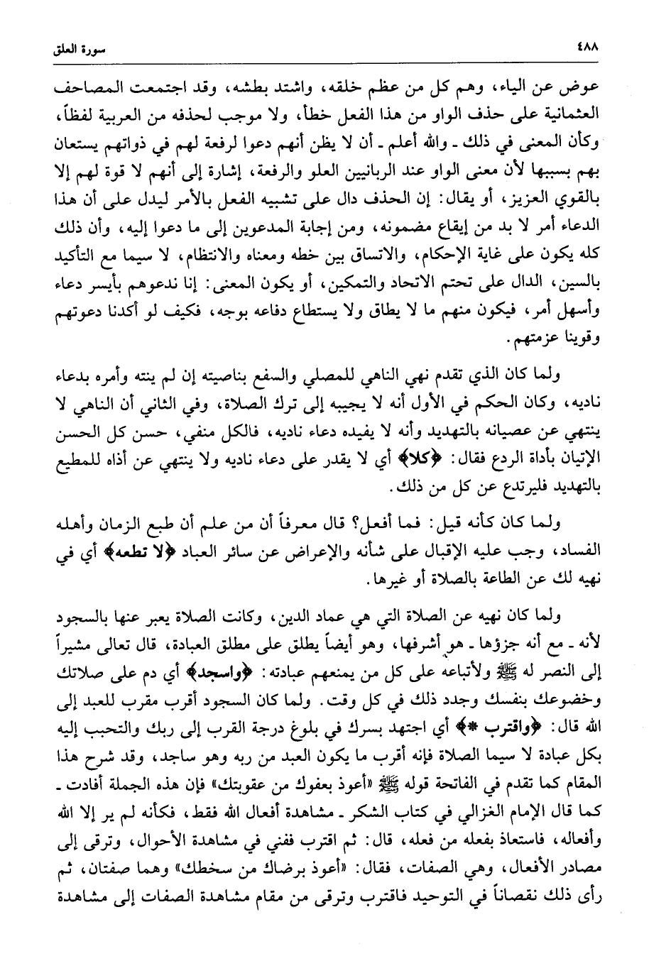 ولما كان نهيه عن الصلاة التي هي عماد الدين ، وكانت الصلاة يعبر عنها بالسجود لأنه - مع أنه جزؤها - هو أشرفها ، وهو أيضاً يطلق على مطلق العبادة ، قال تعالى مشيراً إلى النصر له ( صلى الله عليه وسلم ) ولأتباعه على كل من يمنعهم عبادته : ( واسجد ) أي دم على صلاتك وخضوعك بنفسك وجدد ذلك في كل وقت .