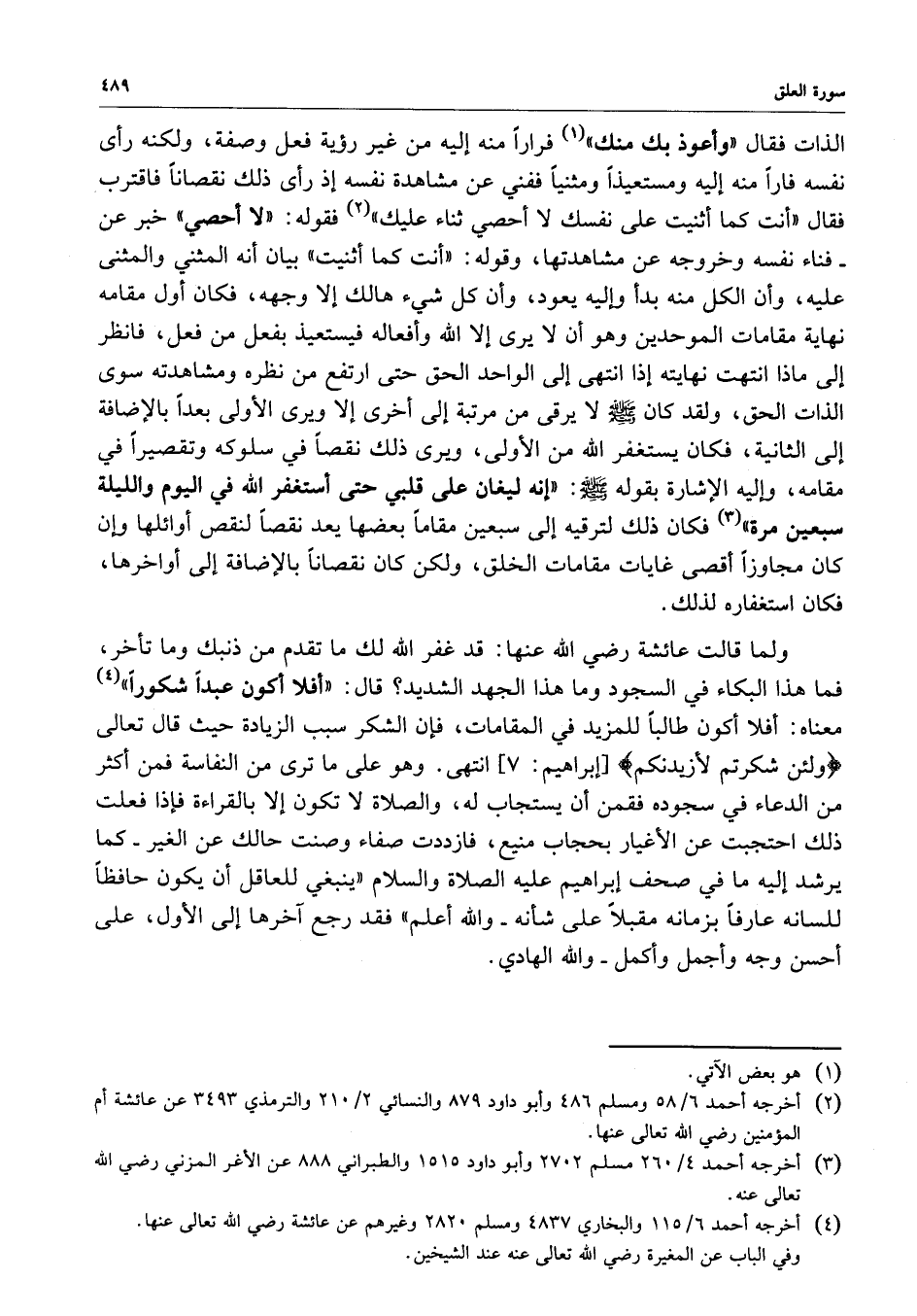 الذات فقال ( وأعوذ بك منك ) فراراً منه إليه من غير رؤية فعل وصفة ، ولكنه رأى نفسه فاراً منه إليه ومستعيذاً ومثنياً ففني عن مشاهدة نفسه إذا رأى ذلك نقصاناً فاقترب فقال ( أنت كما أثنيت على نفسك لا أحصي ثناء عليك ) فقوله : ( لا أحصي ) خبر عن - فناء نفسه وخروجه عن مشاهدتها ، وقوله : ( أنت كما أثنيت ) بيان أنه المثني والمثنى عليه ، وأن الكلم منه بدأ وإليه يعود ، وأن كل شيء هالك إلا وجهه ، فكان أول مقامه نهاية مقامات الموحدين وهو أن لا يرى إلا الله وأفعاله فيستعيذ بفعل من فعل ، فانظر إلى ماذا انتهت نهايته إذا انتهى إلى الواحد الحق حتى ارتفع من نظره ومشاهدته سوى الذات الحق ، ولقد كان ( صلى الله عليه وسلم ) لا يرقى من مرتبة إلى أخرى إلا ويرى الأولى بعداً بالإضافة إلى الثانية ، فكان يستغفر الله من الله من الأولى ، ويرى ذلك نقصاً في سلوكه وتقصيراً في مقامه ، وإليه الإشارة بقوله ( صلى الله عليه وسلم ) : ( إنه ليغان على قلبي حتى أستغفر الله في اليوم والليلة سبعين مرة ) فكان ذلك لترقيه إلى سبيعن مقاماً بعضها يعد نقصاً لنقص أوائلها وإن كان مجاوزاً أقصى غايات مقامات الخلق ، ولكن كان نقصاناً بالإضافة إلى أواخرها ، فكان استغفاره لذلك .
