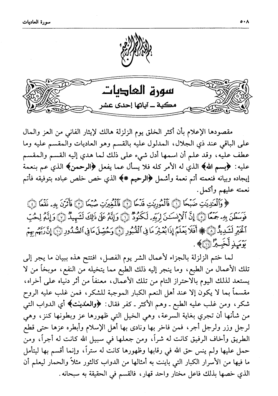 ) وَالْعَادِيَاتِ ضَبْحاً فَالمُورِيَاتِ قَدْحاً فَالْمُغِيرَاتِ صُبْحاً فَأَثَرْنَ بِهِ نَقْعاً فَوَسَطْنَ بِهِ جَمْعاً إِنَّ الإِنسَانَ لِرَبِّهِ لَكَنُودٌ وَإِنَّهُ عَلَى ذَلِكَ لَشَهِيدٌ وَإِنَّهُ لِحُبِّ الْخَيْرِ لَشَدِيدٌ أَفَلاَ يَعْلَمُ إِذَا بُعْثِرَ مَا فِي الْقُبُورِ وَحُصِّلَ مَا فِي الصُّدُورِ إِنَّ رَبَّهُم بِهِمْ يَوْمَئِذٍ لَّخَبِيرٌ ( ( )