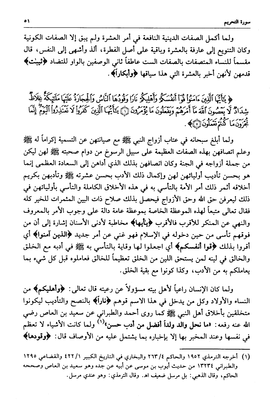 ولما كان الإنسان راعياً أله بيته مسؤولاً عن رعيته قال تعالى : ( وأهليكم ( من النساء والأولاد وكل من يدخل في هذا الاسم قوهم ) ناراً ( بالنصح والتأديب ليكونوا متخلقين بأخلاق أهل النبي ( صلى الله عليه وسلم ) كما روى أحمد والطبراني عن سعيد بن العاص رضي الله عنه رفعه : ( ما نحل والد ولداً أفضل من أدب حسن ) ولما كانت الأشياء لا تعظم في نفسها وعند المخبر بها إلا بإخباره بما يشتمل عليه من الأوصاف قال : ( وقودها (