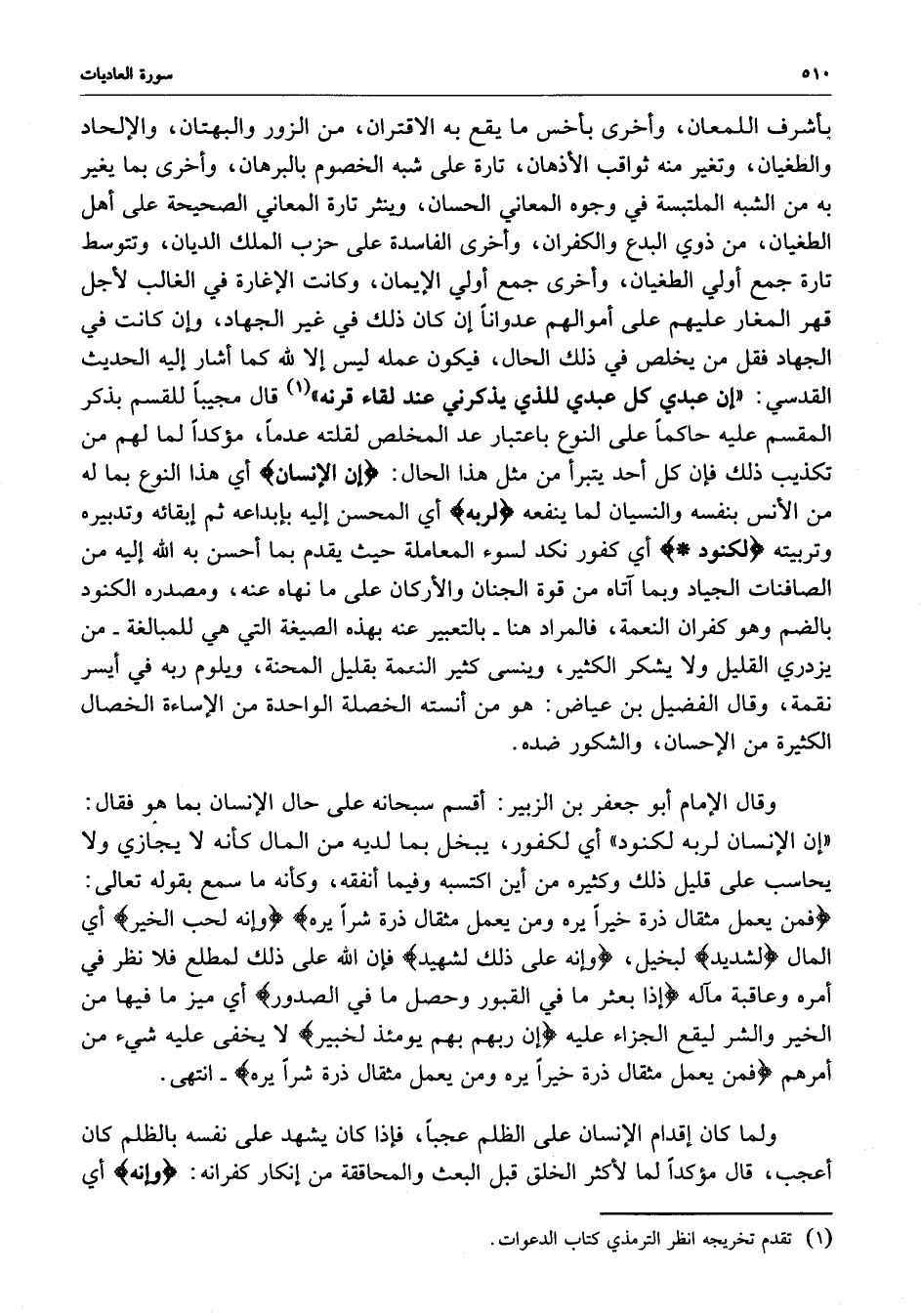 بأشرف اللمعان ، وأخرى بأخس ما يقع به الاقتران ، من الزور والبهتان ، والإلحاد والطغيان ، وتغير منه ثواقب الأذهان ، تارة على شبه الخصوم بالبرهان ، وأخرى بما يغير به الشبه الملتبسة في وجوه المعاني الحسان ، وينثر تارة المعاني الصحيحة على أهل الطغيان ، من ذوي البدع والكفران ، وأخرى الفاسدة على حزب الملك الديان ، وتتوسط تارة جمع أولي الطغيان ، وأخرى جمع أولي الإيمان ، وكانت الإغارة في الغالب لأجل قهر المغار عليهم على أموالهم عدواناً إن كان ذلك في غير الجهاد ، وإن كانت في الجهاد فقل من يخلص في ذلك الحال ، فيكون عمله ليس إلا لله كما أشار إليه الحديث القدسي : ( إن عبدي كل عبدي للذين يذكرني عند لقاء قرنه ) قال مجيباً للقسم بذكر المقسم عليه حاكماً على النوع باعتبار عد المخلص لقلته عدماً ، مؤكداً لما لهم من تكذيب ذلك فإن كل أحد يتبرأ من مثل هذا الحال : ( إن الإنسان ) أي هذا النوع بما له من الأنس بنفسه والنسيان لما ينفعه ) لربه ) أي المحسن إليه بإبداعه ثم إبقائه وتدبيره وتربيته ) لكنود ) أي كفور نكد لسوء المعاملة حيث يقدم بما أحسن به إليه من الصافنات الجياد وبما آتاه من قوة الجنان والأركان على ما نهاه عنه ، ومصدره الكنود بالضم وهو كفران النعمة ، فالمراد هنا - بالتعبير عنه بهذه الصيغة التي هي للمبالغة - من يزدري القليل ولا يشكر الكثير ، وينسى كثير النعمة بقليل المحنة ، ويلوم ربه في أيسر نقمة ، وقال الفضيل بن عياض : هو من أنسته الخصلة الواحدة من الإساءةة الخصال الكثيرة من الإحسان ، والشكور ضده .
