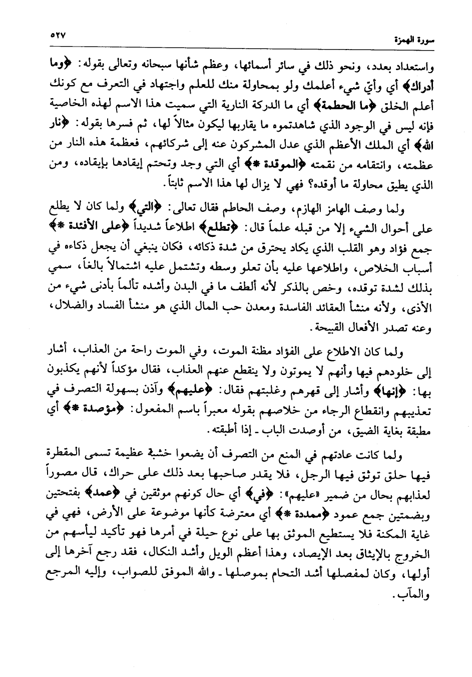 واستعداد بعدد ، ونحو ذلك في سائر أسمائها ، وعظم شأنها سبحانه وتعالى بقوله : ( وما أدراك ) أي وأيّ شيء أعلمك ولو بمحاولة منك للعلم واجتهاد في التعرف مع كونك أعلم الخلق ) ما الحطمة ) أي ما الدركة النارية التي سميت هذا الاسم لهذه الخاصية فإنه ليس في الوجود الذي شاهدتموه ما يقاربها ليكون مثالاً لها ، ثم فسرها بقوله : ( نار الله ) أي الملك الأعظم الذي عدل المشركون عنه إلى شركائهم ، فعظمة هذه النار من عظمته ، وانتقامه من نقمته ) الموقدة ) أي التي وجد وتحتم إيقادها بإيقاده ، ومن الذي يطيق محاولة ما أوقده ؟ فهي لا يزال لها هذا الاسم ثابتاً .