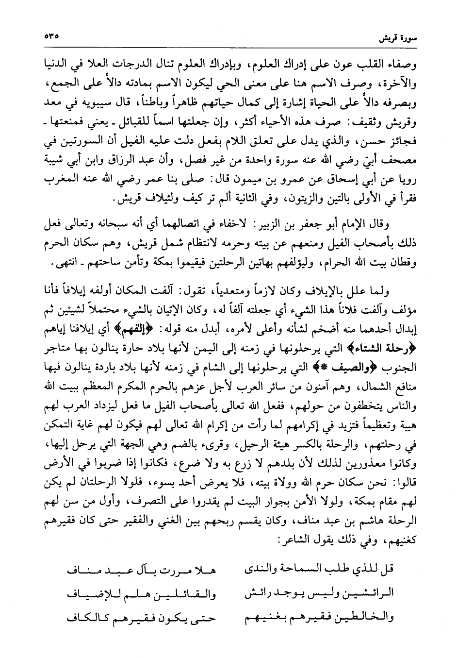 وصفاء القلب عون على إدراك العلوم ، وبإدراك العلوم تنال الدرجات العلا في الدنيا والآخرة ، وصرف الاسم هنا على معنى الحي ليكون الاسم بمادته دالاًّ على الجمع ، وبصرفه دالاًّ على الحياة إشارة إلى كمال حياتهم ظاهراً وباطناً ، قال سيبويه في معد وقريش وثقيف : صرف هذه الأحياء أكثر ، وإن جعلتها اسماً للقبائل - يعني فمنعتها - فجائز حسن ، والذي يدل على تعلق اللام بفعل دلت عليه الفيل أن السورتين في مصحف أبيّ رضي الله عنه سورة واحدة من غير فصل ، وأن عبد الرزاق وابن أبي شيبة رويا عن أبي إسحاق عن عمرو بن ميمون قال : صلى بنا عمر رضي الله عنه المغرب فقرأ في الأولى بالتين والزيتون ، وفي الثانية ألم تر كيف ولئيلاف قريش .