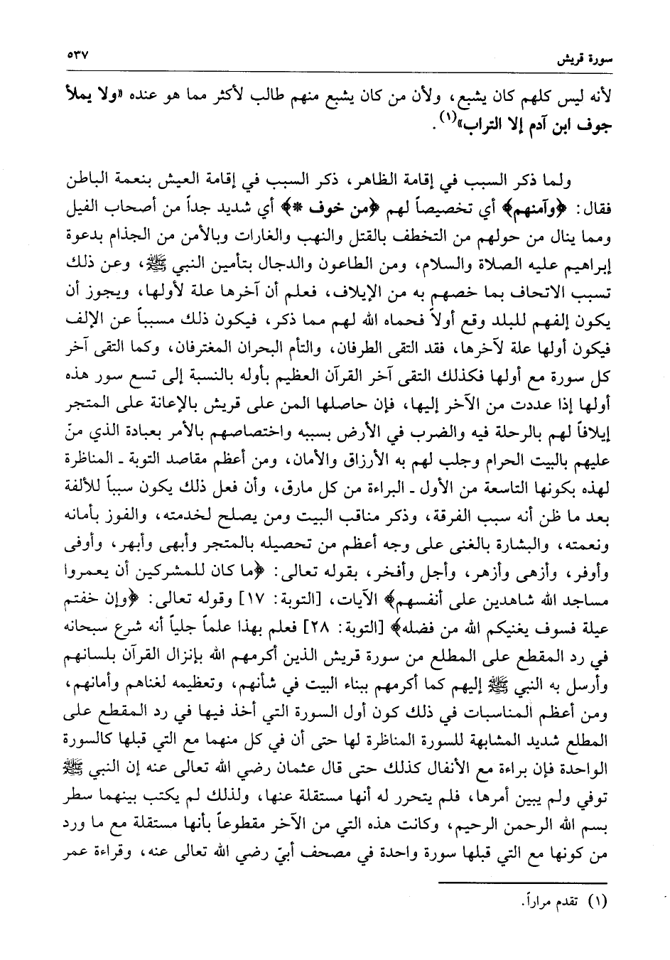 [ التوبة : 28 ] فعلم بهذا علماً جلياً أنه شرع سبحانه في رد المقطع على المطلع من سورة قريش الذين أكرمهم الله بإنزال القرآن بلسانهم وأرسل به النبي ( صلى الله عليه وسلم ) إليهم كما أكرمهم ببناء البيت في شأنهم ، وتعظيمه لغناهم وأمانهم ، ومن أعظم المناسبات في ذلك كون أول السورة التي أخذ فيها في رد المقطع على الواحدة فإن براءة مع الأنفال كذلك حتى قال عثمان رضي الله عنه إن النبي ( صلى الله عليه وسلم ) توفي ولم يبين أمرها ، فلم يتحرر له أنها مستقلة عنها ، ولذلك لم يكتب بينهما سطر بسم الله الرحمن الرحيم ، وكانت هذه التي من الآخر مقطوعاً بأنها مستقلة مع ما ورد من كونها مع التي قبلها سورة واحدة في مصحف أبيّ رضي الله تعالى عنه ، وقراءة عمر
