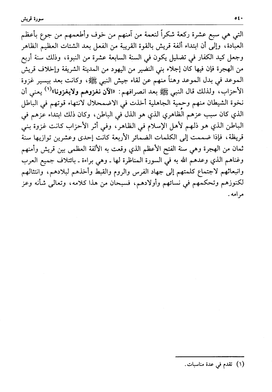 التي هي سبع عشرة ركعة شكراً لنعمة من آمنهم من خوف وأطعمهم من جوع بأعظم العبادة ، وإلى أن ابتداء ألفة قريش بالقوة القريبة من الفعل بعد الشتات العظيم الظاهر وجعل كيد الكفار في تضليل يكون في السنة السابعة عشرة من النبوة ، وذلك سنة أربع من الهجرة فإن فيها كان إجلاء بني النضير من اليهود من المدينة الشريفة وإخلاف قريش الموعد في بدل الموعد وهناً منهم عن لقاء جيش النبي ( صلى الله عليه وسلم ) ، وكانت بعد بيسير غزوة الأحزاب ، ولذلك قال النبي ( صلى الله عليه وسلم ) بعد انصرافهم : ( الآن نغزوهم ولا يغزونا ) يعني أن نخوة الشيطان منهم وحمية الجاهلية أخذت في الاضمحلال لانتهاء قوتهم في الباطل الذي كان سبب عزهم الظاهري الذي هو الذل في الباطن ، وكان ذلك ابتداء عزهم في الباطن الذي هو ذلهم لأهل الإسلام في الظاهر ، وفي أثر الأحزاب كانت غزوة بني قريظة ، فإذا ضممت إلى الكلمات الضمائر الأربعة كانت إحدى وعشرين توازيها سنة ثمان من الهجرة وهي سنة الفتح الأعظم الذي وقعت به الألفة العظمة بين قريش وأمنهم وغناهم الذي وعدهم الله به في السورة المناظرة لها - وهي براءة - باتئلاف جميع العرب وانبعاثهم لاجتماع كلمتهم إلى جهاد الفرس والروح والقبط وأخذهم لبلادهم ، وانتثالهم لكنوزهم وتحكمهم في نسائهم وأولادهم ، فسبحان من هذا كلامه ، وتعالى شأنه وعز مرامه .