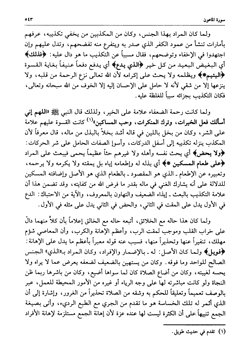 ولما كان المراد بهذا الجنس ، وكان من المكذبين من يخفي تكذيبه ، عرفهم بأمارات تنشأ من عمود الكفر الذي صدر به ويتفرع منه تفضحهم ، وتدل عليهم وإن اجتهدوا في الإخفاء وتوضحهم ، فقال مسبباً عن التكذيب ما هو دال عليه : ( فذلك ) أي البغيض البعيد من كل خير ) الذي يدع ) أي يدفع دفعاً عنيفاً بغاية القسوة ) اليتيم ( ويظلمه ولا يحث على إكرامه لأن الله تعالى نزع الرحمة من قلبه ، ولا ينزعها إلا من شقي لأنه لا حامل على الإحسان إليه إلا الخوف نم الله سبحانه وتعالى ، فكان التكذيب بجزائه سبباً للغلظة عليه .