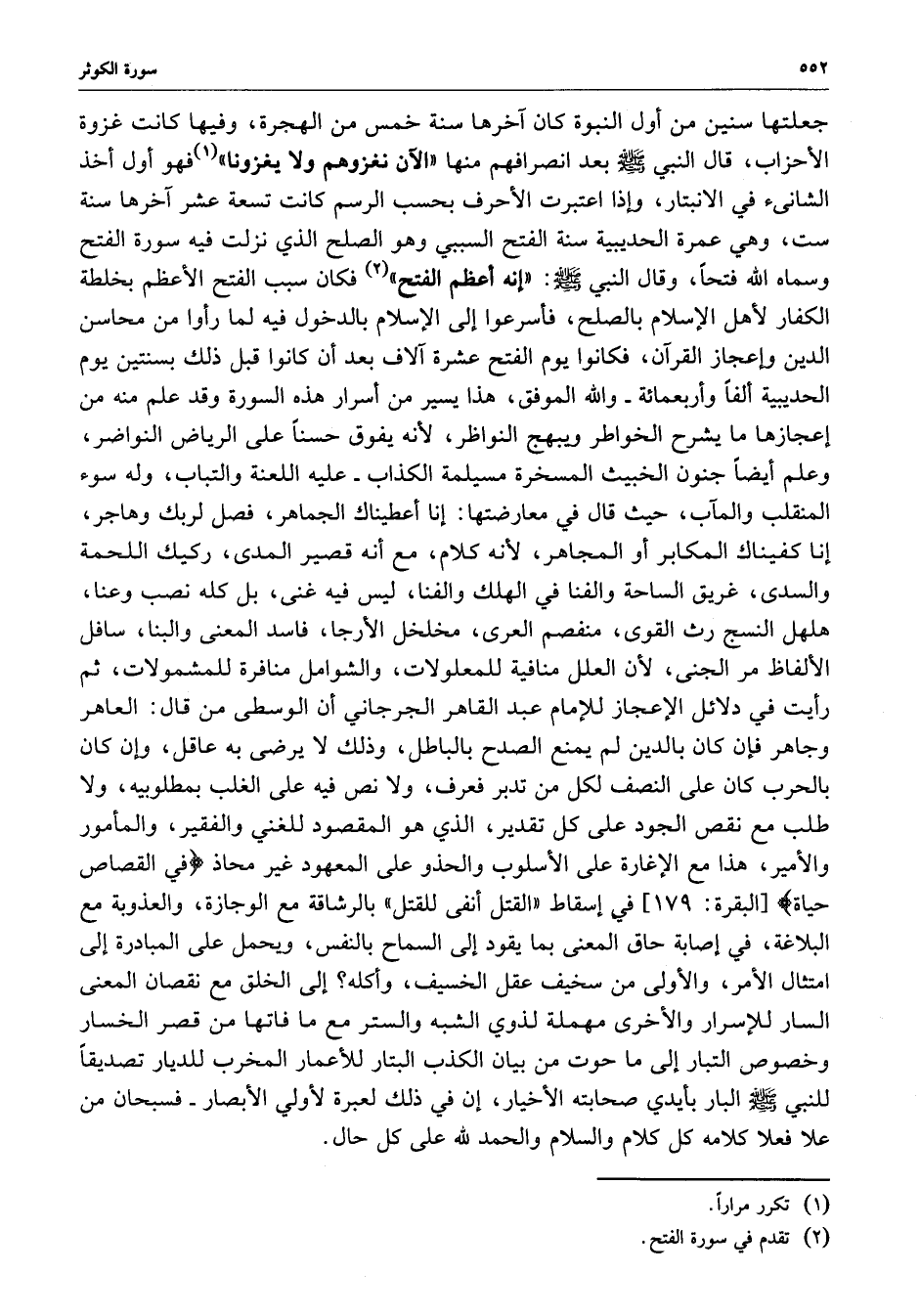 جعلتها سنين من أول النبوة كان آخرها سنة خمس من الهجرة ، وفيها كانت غزوة الأحزاب ، قال النبي ( صلى الله عليه وسلم ) بعد انصرافهم منها ( الآن نغزوهم ولا يغزنا ) فهو أول أخذ الشانئ في الانبتار ، وإذا اعتبرت الأحرف بحسب الرسم كانت تسعة عشر آخرها سنة ست ، وهي عمرة الحديبية سنة الفتح السببي وهو الصلح الذي نزلت فيه سورة الفتح وسماه الله فتحاً ، وقال النبي ( صلى الله عليه وسلم ) : ( إنه أعظم الفتح ) فكان سبب الفتح الأعظم بخلطة الكفار لأهل الإسلام بالصلح ، فأسرعوا إلى الإسلام بالدخول فيه لما رأوا من محاسن الدين وإعجاز القرآن ، فكانوا يوم الفتح عشر آلاف بعد أن كانوا قبل ذلك بسنتين يوم الحديبية ألفاً وأربعمائة - والله الموفق ، هذا يسير من أسرار هذه السورة وقد علم منه من إعجازهم ما يشرح الخواطر ويبهج النواظر ، لأنه يفوق حسناً على الرياض النواضر ، وعلم أيضاً جنون الخبيث المسخرة مسيلمة الكذاب - عليه اللعنة والتباب ، وله سوء المنقلب والمآب ، حيث قال في معارضتها : إنا أعطيناك الجماهر ، فصل لربك وهاجر ، إنا كفيناك المكابر أو المجاهر ، لأنه كلام ، مع أنه قصير المدى ، ركيك اللحمة والسدى ، غريق الساحة والفنا في الهلك والفنا ، ليس فيه غنى ، بل كله نصب وعنا ، هلهل النسج رث القوى ، منفصم العرى ، مخلخل الأرجا ، فاسد المعنى والبنا ، سافل الألفاظ مر الجنى ، لأن العلل منافية للمعلولات ، والشوامل منافرة للمشمولات ، ثم رأيت في دلائل الإعجاز للإمام عبد القاهر الجرجاني أن الوسطى من قال : العاهر وجاهر فإن كان بالدين لم يمنع الصدح بالباطل ، وذلك لا يرضى به عاقل ، وإن كان طلب مع نقص الجود على كل تقدير ، الذي هو المقصود للغني والفقير ، والمأمور والأمير ، هذا مع الإغارة على الأسلوب والحذو على المعهود غير محاذ