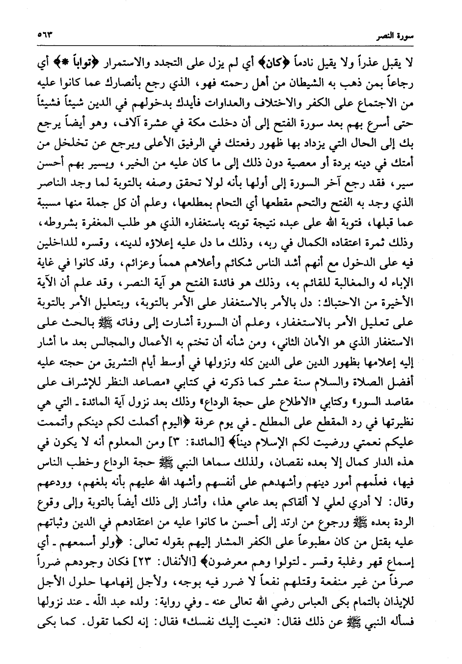 [ المائدة : 3 ] ومن المعلوم أنه لا يكون في هذه الدار كمال إلا بعده نقصان ، ولذلك سماها النبي ( صلى الله عليه وسلم ) حجة الوداع وخطب الناس فيها ، فعلّمهم أمور دينهم وأشهدهم على أنفسهم وأشهد الله عيلهم بأنه بلغهم ، وودعهم وقال : لا أدري لعلي لا ألقاكم بعد عامي هذا ، وأشار إلى ذلك أيضاً بالتوبة وإلى وقوع الردة بعده ( صلى الله عليه وسلم ) ورجوع من ارتد إلى أحسن ما كانوا عليه من اعتقادهم في الدين وثباتهم عليه بقتل من كان مطبوعاً على الكفر المشار إليهم بقوله تعالى :