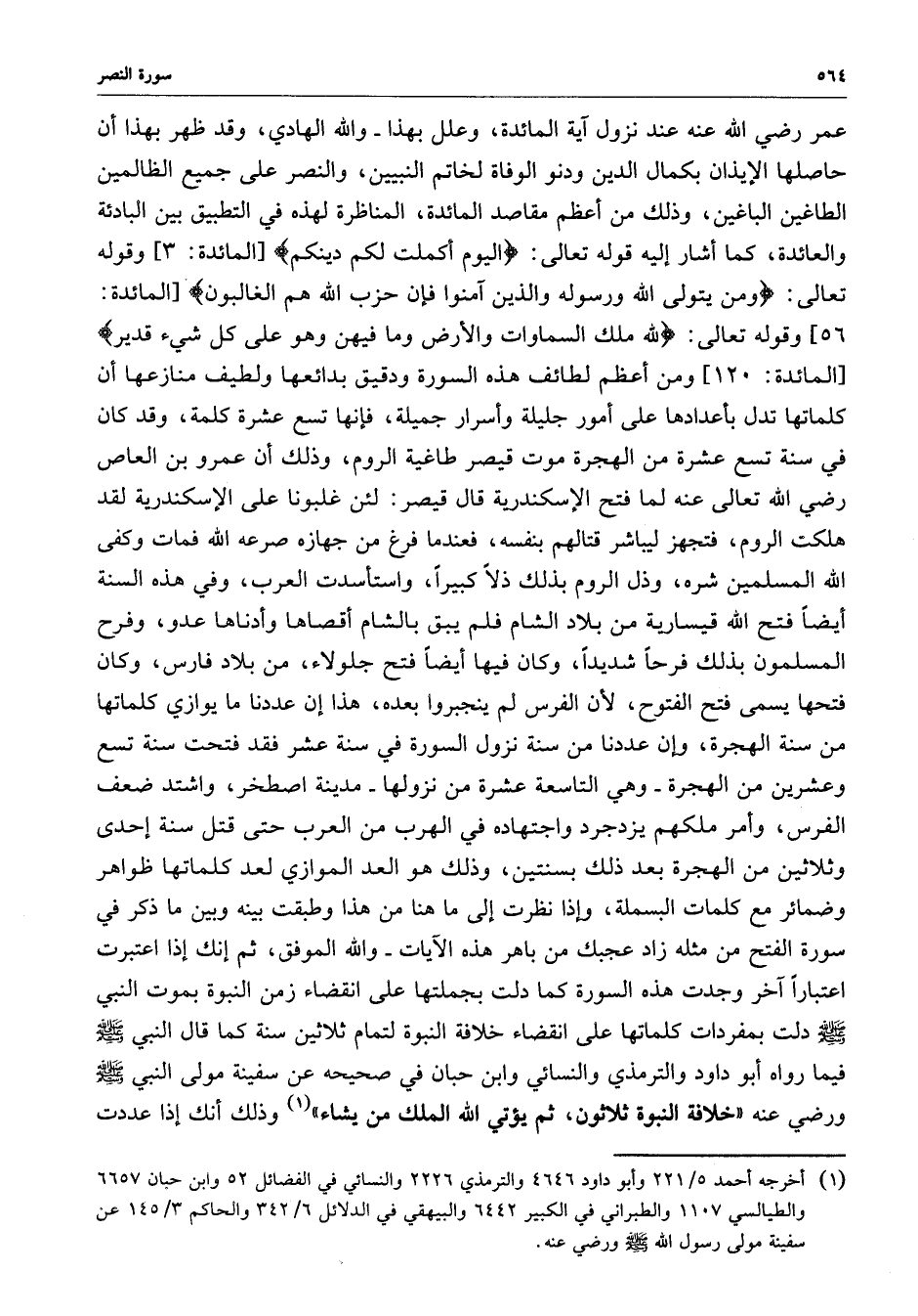 [ المائدة : 120 ] ومن أعظم لطائف هذه السورة ودقيق بدائعها ولطيف منازعها أن كلماتها تدل بأعدادها على أمور جليلة وأسرار جميلة ، فإنها تسع عشرة كلمة ، وقد كان في سنة تسع عشرة من الهجرة موت قيصر طاغية الروم ، وذلك أن عمرو بن العاص رضي الله تعالى عنه لما فتح الإسكندرية قال قيصر : لئن غلبونا على الإسكندرية لقد هلكت الروم ، فتجهز ليباشر قتالهم بنفسه ، فعندما فرغ من جهازه صرعه الله فمات فكفى الله المسلمين شره ، وذلك الروم بذلك ذلاً كبيراً ، واستأسدت العرب ، وفي هذه السنة أيضاً فتح الله قيسارية من بلاد الشام فلم يبق بالشام أقصاها وأدناها عدو ، وفرح المسلمون بذلك فرحاً شديداً ، وكان فيها أيضاً فتح جلولاء ، من بلاد فارس ، وكان فتحها يسمى فتح الفوح ، لأن الفرس لم ينجبروا بعده ، هذا إن عددنا ما يوازي كلماتها من سنة الهجرة - وهي التاسعة عشرة من نزولها - مدينة اصطخر ، واشتد ضعف الفرس ، وأمر ملكهم يزدجرد واجتهاده في الهرب من العرب حتى قتل سنة إحدى وثلاثين من الهجرة بعد ذلك بسنتين ، وذلك هو العد الموازي لعد كلماتها ظواهر وضمائر مع كلمات البسملة ، وإذا نظرت إلى ما هنا من هذا وطبقت بينه وبين ما ذكر في سورة الفتح من مثله زاد عجبك من باهر هذه الآيات - والله الموفق ، ثم إنك إذا اعتبرت اعتباراً آخر وجدت هذه السورة كا دلت بجملتها على انقضاء زمن النبوة بموت النبي ( صلى الله عليه وسلم ) دلت بمفردات كلماتها على انقضاء خلافة النبوة لتمام ثلاثين سنة كما قال النبي ( صلى الله عليه وسلم ) فيما رواه أبو داود والترمذي ولانسائي وابن حبان في صحيحه عن سفينة مولى النبي ( صلى الله عليه وسلم ) ورضى عنه ( خلافة النبوة ثلاثون ، ثم يؤتي الله الملك من يشاء ) وذلك أنك إذا عددت