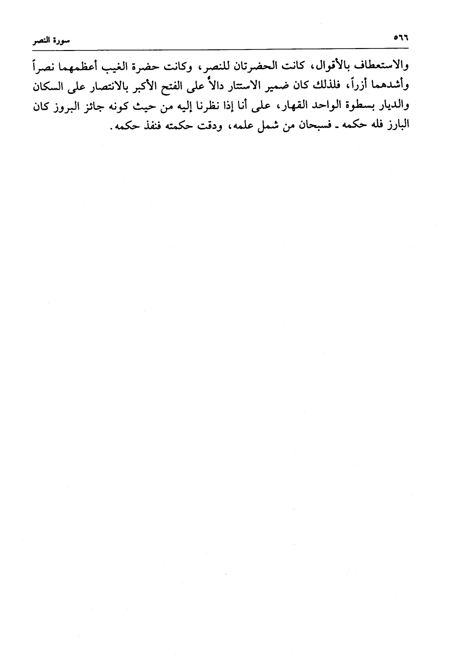 والاستعطاف بالأقوال ، كانت الحضرتان للنصر ، وكانت حضرة الغيب أعظمهما نصراً وأشدهما أزراً ، فلذلك كان ضمير الاستتار دالاًّ على الفتح الأكبر بالانتصار على السكان والديار بسطوة الواحد القهار ، على أنا إذا نظرنا إليه من حيث كونه جائز البروز كان البارز فله حكمه - فسبحان من شمل علمه ، ودقت حكمته فنفذ حكمه .
