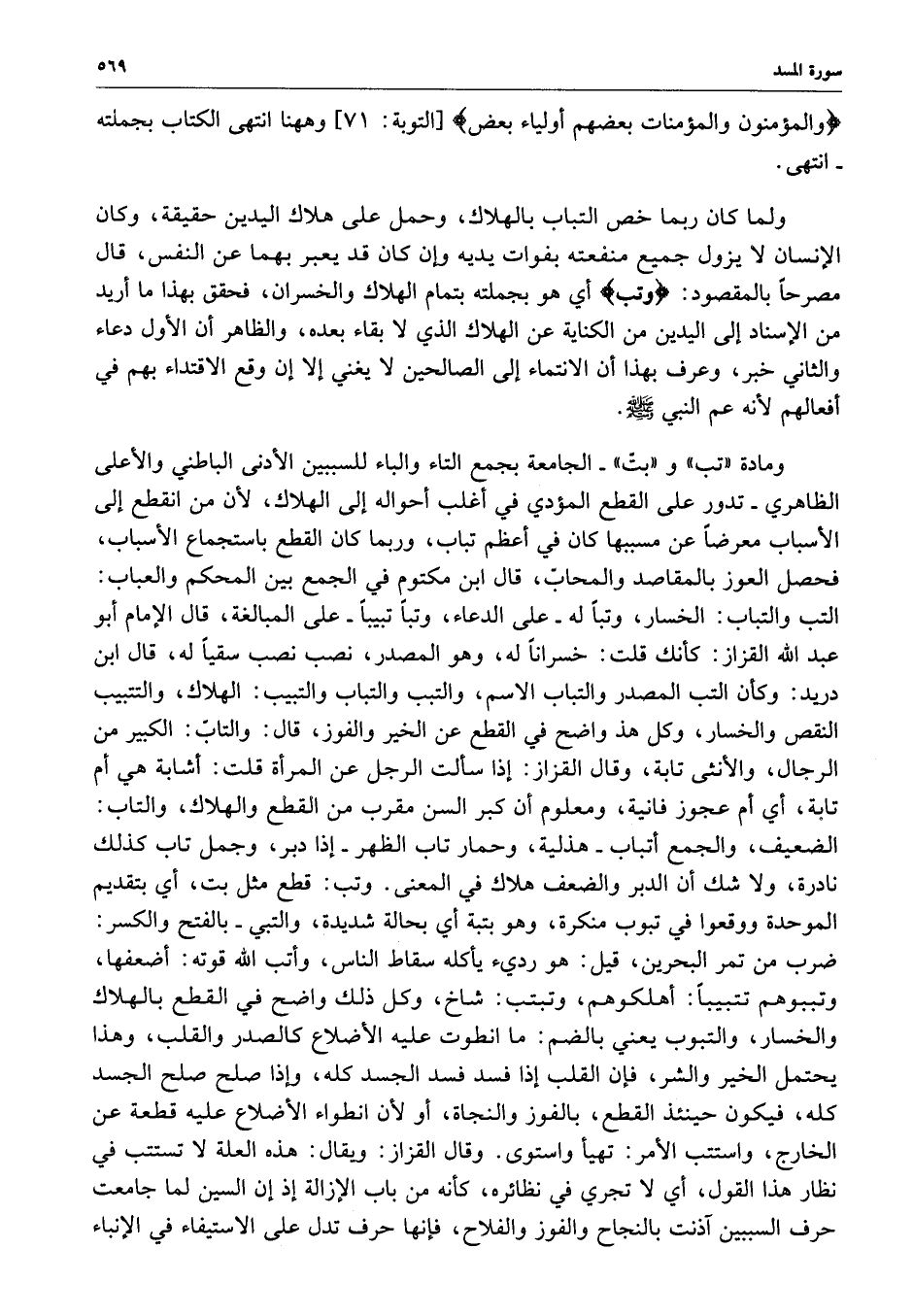 ولما كان ربما خص التباب بالهلاك ، وحمل على هلاك اليدين حقيقة ، وكان الإنسان لا يزول جميع منفعته بفوات يديه وإن كان قد يعبر بهما عن النفس ، قال مصرحاً بالمقصود : ( وتب ) أي هو بجملته بتمام الهلاك والخسران ، فحقق بهذا ما أريد من الإسناد إلى اليدين من الكناية عن الهلاك الذي لا بقاء بعده ، والظاهر أن الأول دعاء والثاني خبر ، وعرف بهذا أن الانتماء إلى الصالحين لا يغني إلا إن وقع الاقتداء بهم في أفعالهم لأنه عم النبي ( صلى الله عليه وسلم ) .