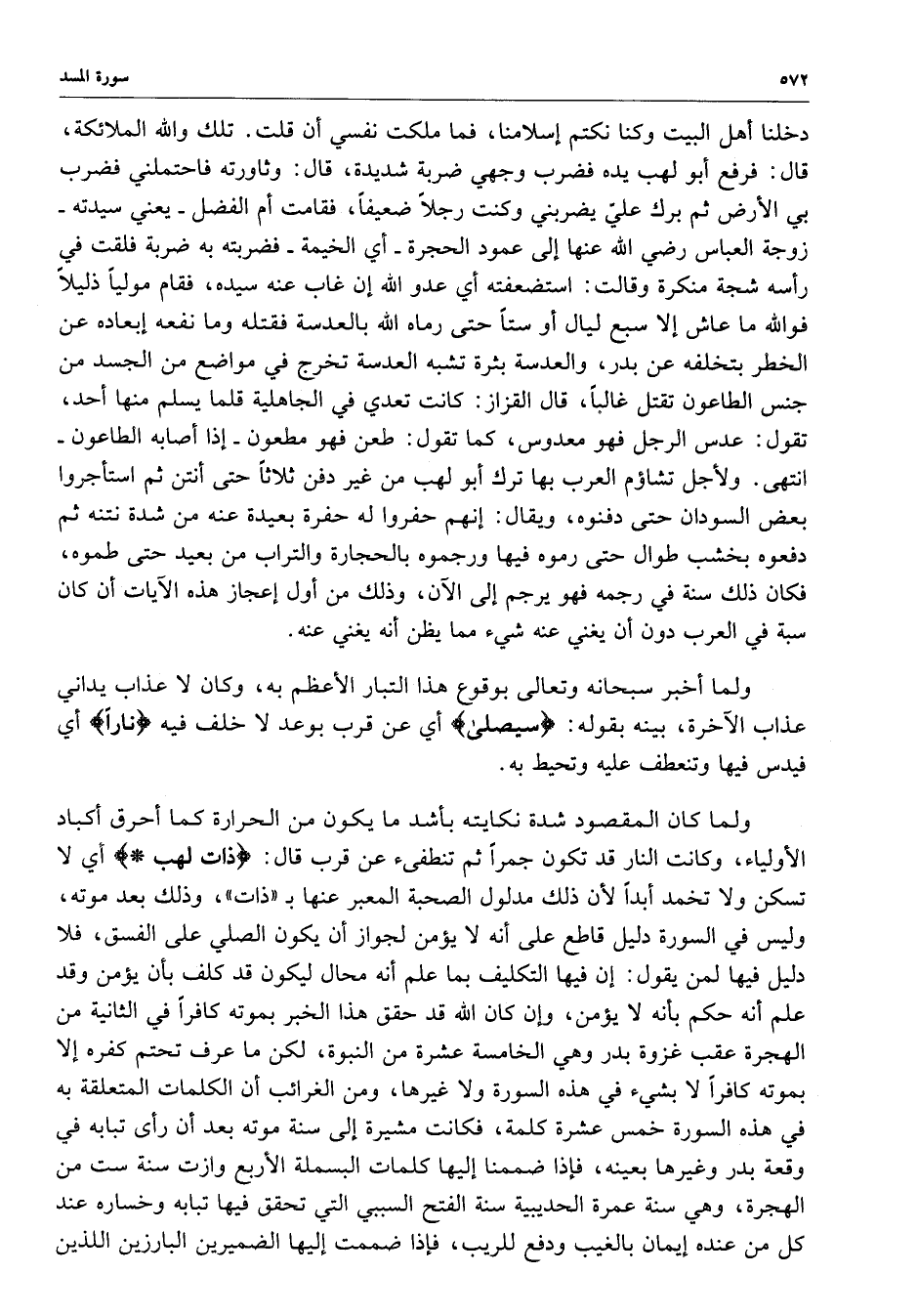 ولأجل تشاؤم العرب بها ترك أبو لهب من غير دفن ثلاثاً حتى أنتن ثم استأجروا بعض السودان حتى دفنوه ، ويقال : إنهم حفروا له حفرة بعيدة عنه من شدة نتنه ثم دفعوه بخشب طوال حتى رموه فيها ورجموه بالحاجرة والتراب من بعيد حتى طموه ، فكان ذلك سنة في رجمه فهو يرجم إلى الآن ، وذلك من أول إعجاز هذه الآيات أن كان سبة في العرب دون أن يغني عنه شيء مما يظن أنه يغني عنه .