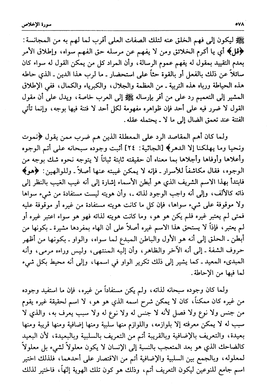ولما كان وجوده سبحانه لذاته ، ولم يكن مستفاداً من غيره ، فإن ما استفيد وجوده من غيره كان ممكناً ، كان لا يمكن شرح اسمه الذي هو هو ، لا اسم حقيقة غيره يقوم من جنس ولا نوع ولا فصل لأنه لا جنس لا ولا نوع له ولا سبب يعرف به ، والذي لا سبب له لا يمكن معرفته إلا بلوازمه ، واللوازم منها سلبية ومنها إضافية ومنها قريبة ومنها بعيدة ، والتعريف بالإضافية وبالقريبة أتم من التعريف بالسلبية وبالبعيدة ، لأن البعيد كالضحاك الذي هو بعد المتعجب بالنسبة إلى الإنسان لا يكون معلولاً لشيء بل معلولاً لمعلوه ، وبالجمع بين السلبية والإضافية أتم من الاقتصار على أحدهما ، فلذلك اختير اسم جامع للنوعين ليكون التعريف أتم ، وذلك هو كون تلك الهوية إلهاً ، فاختير لذلك