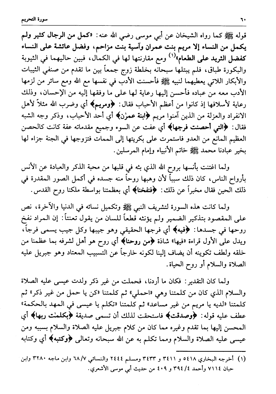 قوله ( صلى الله عليه وسلم ) كما رواه الشيخان عن أبي موسى رضي الله عنه : ( كمل من الرجال كثير ولم يكمل من النساء إلا مريم بنت عمران وآسية بنت مزاحم ، وفضل عائشة على النساء كفضل الثريد على الطعام ) ومع مقارنتها لها في الكمال ، فبين حاليهما في الثيوبة والبكورة طباق ، فلم يبتلها سبحانه بخلطة زوج جمعاً بين ما تقدم من صنفي الثيبات والأبكار اللاتي يعطيهما لنبيه ( صلى الله عليه وسلم ) فأحسنت الأدب في نفسها مع الله ومع سائر من لزمها الأدب معه من عباده فأحسن إليها رعاية لها على ما وفقها إليه من الإحسان ، وذلك رعاية لأسلافها إذ كانوا من أعظم الأباب فقال : ( ومريم ) أي وضرب الله مثلاً لأهل الانفراد والعزلة من الذين آمنوا مريم ) ابنة عمران ) أي أحد الأحباب ، وذكر وجه الشبه فقال : ( التي احصنت فرجها ) أي عفت عن السوء وجميع مقدماته عفة كانت كالحصن العظيم المانع من العدو فاستمرت على بكريتها إلى الممات فتزوجها في الجنة جزاء لها بخير عبادنا محمد ( صلى الله عليه وسلم ) خاتم الأنبياء وإمام المرسلين .