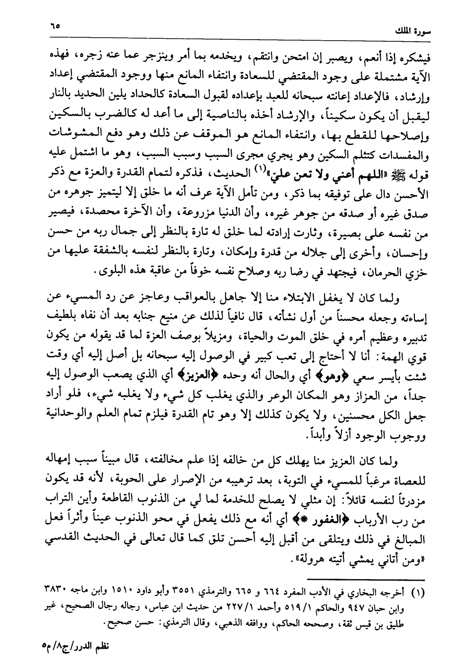 فيشكره إذا أنعم ، ويصبر إن امتحن وانتقم ، ويخدمه بما أمر وينزجر عما هنه زجره ، فهذه الآية مشتملة على وجود المقتضي للسعادة وانتفاء المانع منها ووجود المقتضي إعداد وإرشاد ، فالإعداد إعانته سبحانه للعبد بإعداده لقبول السعادة كالحداد يلين الحديد بالنار ليقبل أن يكون سكيناً ، والإرشاد أخذه بالناصية إلى ما أعد له كالضرب بالسكين وإصلاحها للقطع بها ، وانتفاء المانع هو الموقف عن ذلك وهو دفع المشوشات والمفسدات كتثلم السكين وهو يجري السبب وسبب السبب ، وهو ما اشتمل عليه قوله ( صلى الله عليه وسلم ) ( اللهم أعني ولا تعن عليّ ) الحديث ، فذكره لتمام القدرة والعزة مع ذكر الأحسن دال على توفيقه بما ذكرن ومن تأمل لآية عرف أنه ما خلق لا ليتميز جوهره من صدق غيره أو صدق غيره ، وأن الدنيا مزروعة ، وأن الآخرة محصدة ، فيصير من نفسه على بصيرة ، وثارت إرادته لما خلق له تارة بالنظر إلى جمال ربه من حسن وإحسان ، وأخرى إلى جلاله من قدرة وإمكان ، وتارة بالنظر لنفسه بالشفقة عليها من خزي الحرمان ، فيجتهد في رضا ربه وصلاح نفسه خوفاً من عاقبة هذه البلوى .