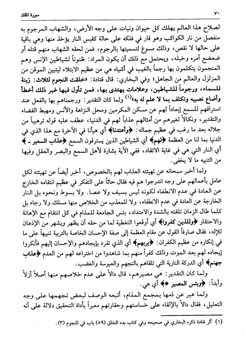 لصلاح هذا العالم يهلك كل حيوان ونبات على وجه الأرض ، والشهاب المرجوم به منفصل من نار الكواكب وهو قار في فلكه على حالة كقبس النار يؤخذ منها وهي باقية على حالها لا نقص ، وذلك مسوغ لتسميتها بالرجوم ، فمن لحقه الشهاب منهم قتله أو ضعضع أمره وخبله ، ويحتمل مع ذلك أن يكون المراد : ظنوناً لشياطين الإنس وهم المنجمون يتكلمون بها رجماً بالغيب في أشياء هي من عظيم الابتلاء ليتبين الموقن من المزلزل والعالم من الجاهل ؛ وفي البخاري : قال قتادة : ( خلقت النجوم لثلاث : زينة للسماء ، ورجوماً للشياطين ، وعلامات يهتدى بها ، فمن تأول فيها غير ذلك أخطأ وأضاع نصيبه وتكلف بما لا علم له به ) ولما كان التقدير : ورجمناهم بها بالفعل عند استراقهم للسمع إبعاداً لهم عن مسكن المكرمين ومحل النزاهة والأنس ومهبط القضاء والتقدير ، ونكالاً لغيرهم من أمثالهم عذاباً لهم في الدنيا ، عطف عليه قوله ترهيباً من جلاله بعد ما رغب في عظيم جماله : ( وأعتدنا ) أي هيأنا في الآخرة مع هذا الذي في الدنيا بما لنا من العظمة ) لهم ) أي الشياطين الذين يسترقون السمع ) عذاب السعير - ) أي النار التي هي في غاية الاتقاد ، ففي الآية بشارة أهل السمع والبصرو العقل وفيها من التنبيه ما لا يخفى .