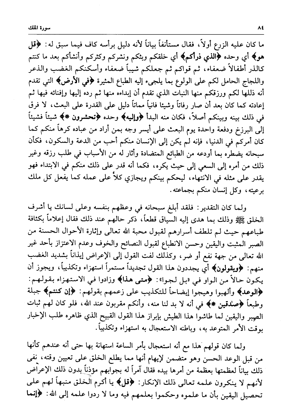 ولما كان قولهم هذا مع أنه استعجال بأمر الساعة استهانة بها حتى أنه عندهم كأنها من قبل الوعد الحسن وهو متضمن لإيهام أنها مما يطلع الخلق على تعيين وقته ، فنى ذلك بياناً لعظمتها بعظمة من أمرها بيده فقال آمراً له بجوابهم مؤذناً ذلك الإعراض لأنهم لا ينكرون علمه تعالى ذلك الإنكار : ( قل ( يا أكرم الخلق منبهاً لهم على تحصيل اليقين بأن ما علموه وحكموا بعلمهم فيه وما لا ردوا علمه إلى الله : ( إنما