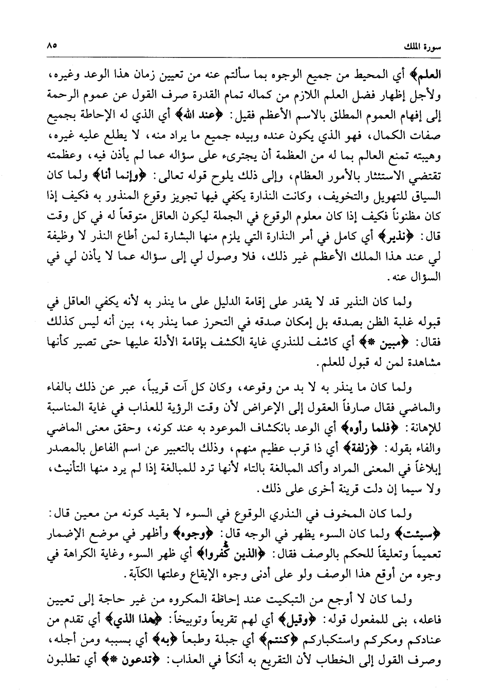 العلم ) أي المحيط من جميع الوجوه بما سألتم عنه من تعيين زمان هذا الوعد وغيره ، ولأجل إظهار فضل العلم اللازم من كماله تمام القدرة صرف القول عن عموم الرحمة إلى إفهام العموم المطلق بالاسم الأعظم فقيل : ( عند الله ) أي الذي له الإحاطة بجميع صفات الكمال ، فهو الذي يكون عنده وبيده جميع ما يراد منه ، لا يطلع عليه غيره ، وهيبته تمنع العالم بما له من العظمة أن يجترئ على سواله عما لم يأذن فيه ، وعظمته تقتضي الاستئثار بالأمرو العظام ، وإلى ذلك يلوح قوله تعالى : ( وإنما أنا ( ولما كان السياق للتهويل والتخويف ، وكانت النذارة يكفي فيها تجويز وقوع المنذور به فكيف إذا كان مظنوناً فكيف إذ كان معلوم الوقوع في الجملة ليكون العاقل متوقعاً له في كل وقت قال : ( نذير ) أي كامل في أمر النذارة التي يلزم منها ا لبشارة لمن أطاع النذر لا وظيفة لي عند هذا الملك الأعظم غير ذلك ، فلا وصول لي إلى سؤاله عما لا يأذن لي في السؤال فيه .