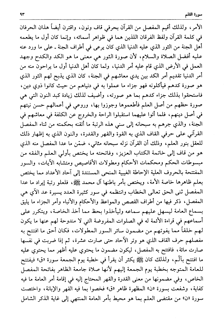 الأمر ، ولذلك أقيم المفصل من القرى بحرفي قاف ونون ، واقترن أيضاً هذان الحرفان في كلمة القرآن ولفظ الفرقان اللذين هما في ظواهر أسمائه ، وإنما كان أول ما يطعمه أهل الجنة من الثور الذي عليه الدنيا الذي كان يرعى في أطراف الجنة - على ما ورد عنه عليه أفضل الصلاة والسلام ، لأن صورة الثور هي معنى ما هو الكد والكدح وجهد العمل في الأرض الذي قام عليه أمر الدنيا ، ولما كان أهل الدنيا أول ما يراحون منه من أمر الدنيا تقديم أمر الكد بين يدي معاشهم في الجنة ، كان الذي يذبح لهم الثور الذي هو صور كدهم فيأكلونه فهو جزاء ما عملو به في دنياهم من حيث كانوا يذوي دين ، فاستحقوا بذلك جزاء كدهم بما هو صورته ، وأضيف لذلك زيادة كبد النون التي هي صورة حظهم نم أصل العلم فأطعموها وجوزوا بها ، وروعي في أعمالهم حسن نيتهم في أصل دينهم ، فلما أتوا عليهما استقبلوا الراحة والخروج عن الكلفة في معاشهم في الجنة ، والذي جرهم به سبحانه إلى سني هذه الرتبة ما أتقنه بحكمته من ثناء المفصل القرآني على حرفي القاف الذي به القوة والقهر والقدرة ، والنون الذي به إظهار ذلك للعقل بنور العلم ، وذلك أن القرآن نزله سبحانه مثاني ، ضمّن ما عدا المفصل منه الذي هو من قاف إلى خاتمة الكتاب العزيز ، وفاتحته ما يختص بأولي العلم والفقه من مبسوطات الحكم ومحكمات الأحكام ومطولات الأقاصيص ومتشابه الآيات ، والسور المفتتحة بالحروف العلية الإحاطة الغيبية المنحى المستندة إلى آحاد الأعداد مما يختص بعلم ظاهرها خاصة الأمة ، ويختص بأمر باطنها آل محمد ( صلى الله عليه وسلم ) ، فلعلو رتبة إيراد ما عدا المفصل ثنى الحق تعالى الخطاب وانتظمه في سورة كثيرة العدد يسيرة عد الآي هي المفصل ، ذكر فيها من أطراف القصص والمواعظ والأحكام والأنباء وأمر الجزاء ما يليق بسماع العامة ليسهل عليهم سماعه وليأخذوا بحظ مما أخذ الخاصة ، ويتكرر على أسماعهم في قراءة الأئمة له في الصلوات المفروضة التي لا مندوحة لهم عنها ما يكون لهم خلقاً مما يفوتهم من مضمون سائر السورة المطولات ، فكان أحق ما افتتح به مفصلهم حرف القاف الذي هو وتر الآحاد حتى صارت عشرة ، ثم إذا ضربت في نفسها صارت مائة ، فافتتح به المفصل ، ليكون مضمون ما يحتوي عليه أظهر مما يحتوي عليه ما افتتح بآلم ، ولذلك كان ( صلى الله عليه وسلم ) يكثر أن يقرأ في خطبة الجمعة سورة ( ق ) فيفتتح للعامة المتوجه بخطبة يوم الجمعة إليهم لأنها صلاة جامعة الظاهر بفاتحة المفصل الخاص ، وفي مضمونها من معنى القدرة والقهر المحتاج إليه في إقامة أمر العامة ما فيه كفاية ، وشفعت بسورة ( ن ) المظهرة ظاهر ( ق ) فخصوا بما فيه القهر الإبانة ، واختصت سورة ( ن ) من مقتضى العلم بما هو محيط بأمر العامة المنتهي إلى غاية الذكر الشامل