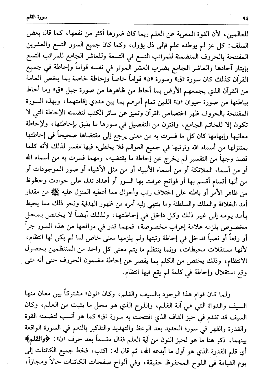 ولما كان قوام هذا الوجود بالسيف والقلم ، وكان ( نون ) مشتركاً بين معان منها السيف والدواة التي هي آلة القلم ، واللوح الذي هو محل ما يثبت من العلم ، وكان السيف قد تقدم في حيز القاف الذي افتتحت به سورة ( ق ) كما هو أنسب لتضمنه القوة والقدرة والقهر في سورة الحديد بعد الوعظ والتهديد والتذكير بالنعم في السورة الواقعة بينهما ، ذكر هنا ما هو لحيز النون من آية العلم فقال مقسماً بعد حرف ( ن ) : ( والقلم ) أي قلم القدرة الذي هو أول ما أبدعه الله ، ثم قال له : اكتب ، فخط جميع الكائنات إلى يوم القيامة في اللوح المحفوظ حقيقة ، وفي ألواح صفحات الكائنات حالاً ومجازاً ،