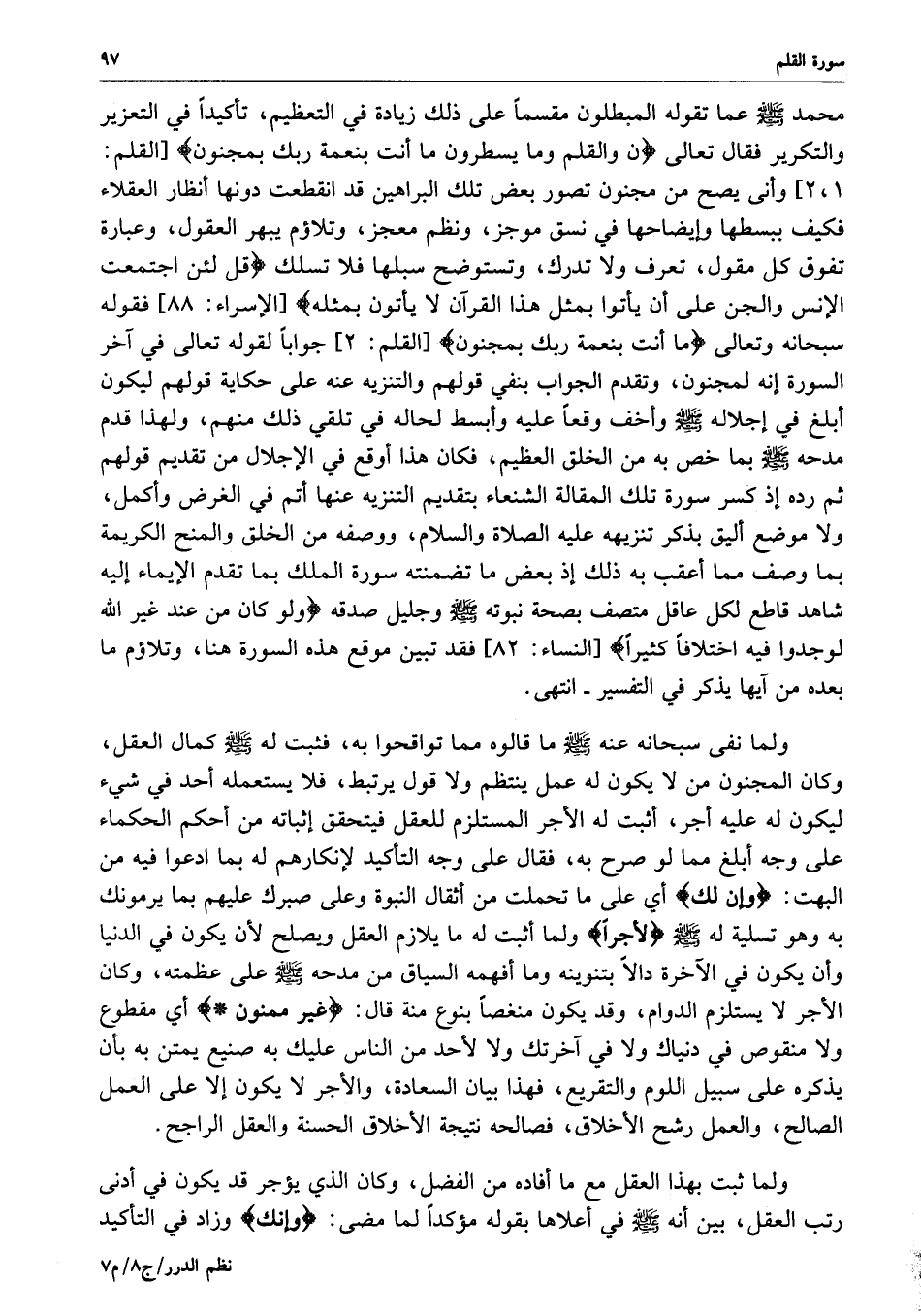 [ القلم : 1 ، 2 ] وأنى يصح من مجنون تصور بعض تلك البراهين قد انقطعت دونها أنظار العقلاء فكيف ببسطها وإيضاحها في نسق موجز ، ونظم معجز ، وتلاؤم يبهر العقول ، وعبارة تفوق كل مقول ، تعرف ولا تدرك ، وتستوضح سبلها فلا تسلك