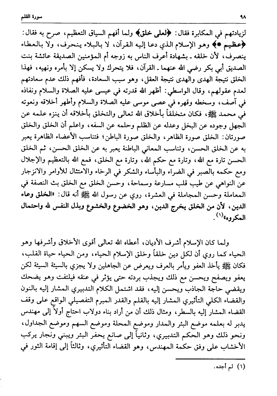 ولما كان الإسلام أشرف الأديان ، أعطاه الله تعالى أقوى الأخلاق وأشرفها وهو الحياء كما روي أن لكل دين خلقاً وخلق الإسلام الحياء ، ومن الحياء حياة القلب ، فكان ( صلى الله عليه وسلم ) يأخذ العفو ويأمر بالعرف ويعرض عن الجاهلين ولا يجزي بالسيئة السيئة لكن يعفو ويصفح ويحسن مع ذلك ويجذب بردته حتى يؤثر في عنقه فيلتفت وهو يضحك ويقضي حاجة الجاذب ويحسن إليه ، فقد اشتمل الكلام التدبيري المشار إليه بالنون والقضاء الكلي التأثيري المشار إليه بالقلم والقدر المبرم التفصيلي الواقع على وقف القضاء المشار إليه بالسطر ، ومثال ذلك أن من أراد بناء دولاب احتاج أولاً إلى مهندس يدبر له بعلمه موضع البئر والمدار وموضع المحلة وموضع السهم وموضع الجداول ، ونحو ذلك وهو الحكم التدبيري ، ثانياً إلى صانع يحفر البئر ويبني ونجار يركب الأخشاب على وفق حكمة المهندس ، وهو القضاء التأثيري ، وثالثاً إلى إقامة الثور في