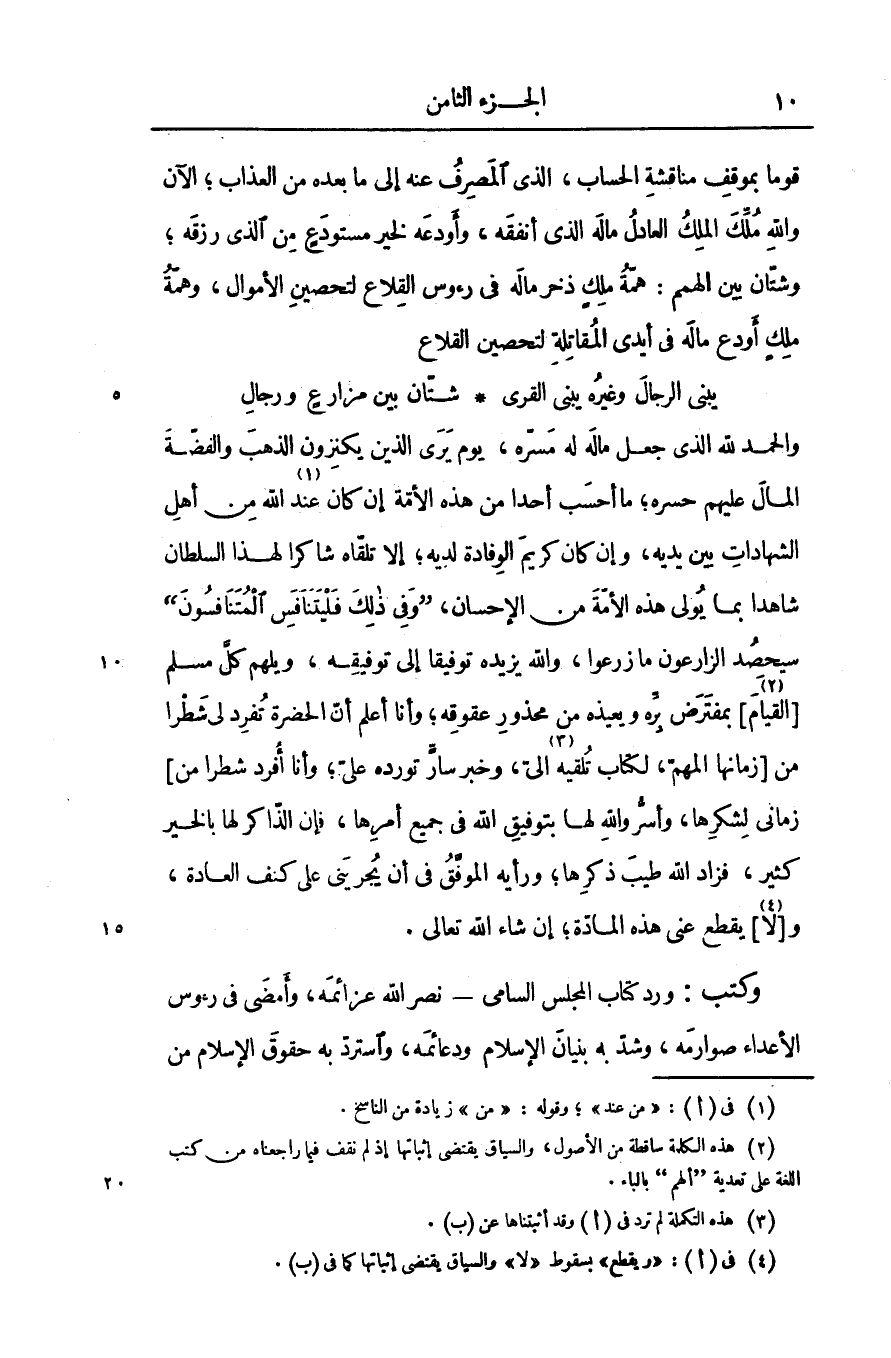 والحمد لله الذى جعل ماله له مسرّه، يوم يرى الذين يكنزون الذهب والفضّة المال عليهم حسره؛ ما أحسب أحدا من هذه الأمّة إن كان عند «1» الله من أهل الشهادات بين يديه، وإن كان كريم الوفادة لديه؛ إلا تلقّاه شاكرا لهذا السلطان شاهدا بما يولى هذه الأمّة من الإحسان، «وفى ذلك فليتنافس المتنافسون» سيحصد الزارعون ما زرعوا، والله يزيده توفيقا إلى توفيقه، ويلهم كلّ مسلم [القيام «2» ] بمفترض برّه ويعيذه من محذور عقوقه؛ وأنا أعلم أنّ الحضرة تفرد لى شطرا من [زمانها المهم، لكتاب تلقيه «3» الىّ، وخبر سارّ تورده علىّ؛ وأنا أفرد شطرا من] زمانى لشكرها، وأسرّ والله لها بتوفيق الله فى جميع أمرها، فإن الذّاكر لها بالخير كثير، فزاد الله طيب ذكرها؛ ورأيه الموفّق فى أن يجرينى على كنف العادة، و [لا «4» ] يقطع عنى هذه المادّة؛ إن شاء الله تعالى.