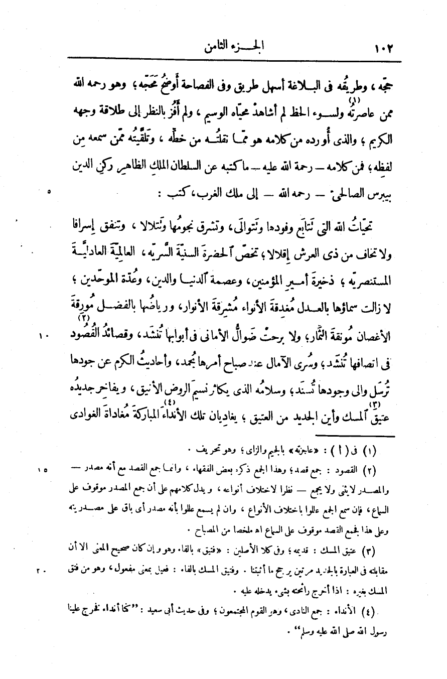حجّه، وطريقه فى البلاغة أسهل طريق وفى الفصاحة أوضح محجّه؛ وهو رحمه الله ممن عاصرته «1» ولسوء الحظ لم أشاهد محيّاه الوسيم، ولم أفز بالنظر إلى طلاقة وجهه الكريم؛ والذى أورده من كلامه هو ممّا نقلته من خطّه، وتلقّيته ممّن سمعه من لفظه؛ فمن كلامه- رحمة الله عليه- ما كتبه عن السلطان الملك الظاهر ركن الدين بيبرس الصالحىّ- رحمه الله- إلى ملك الغرب، كتب: