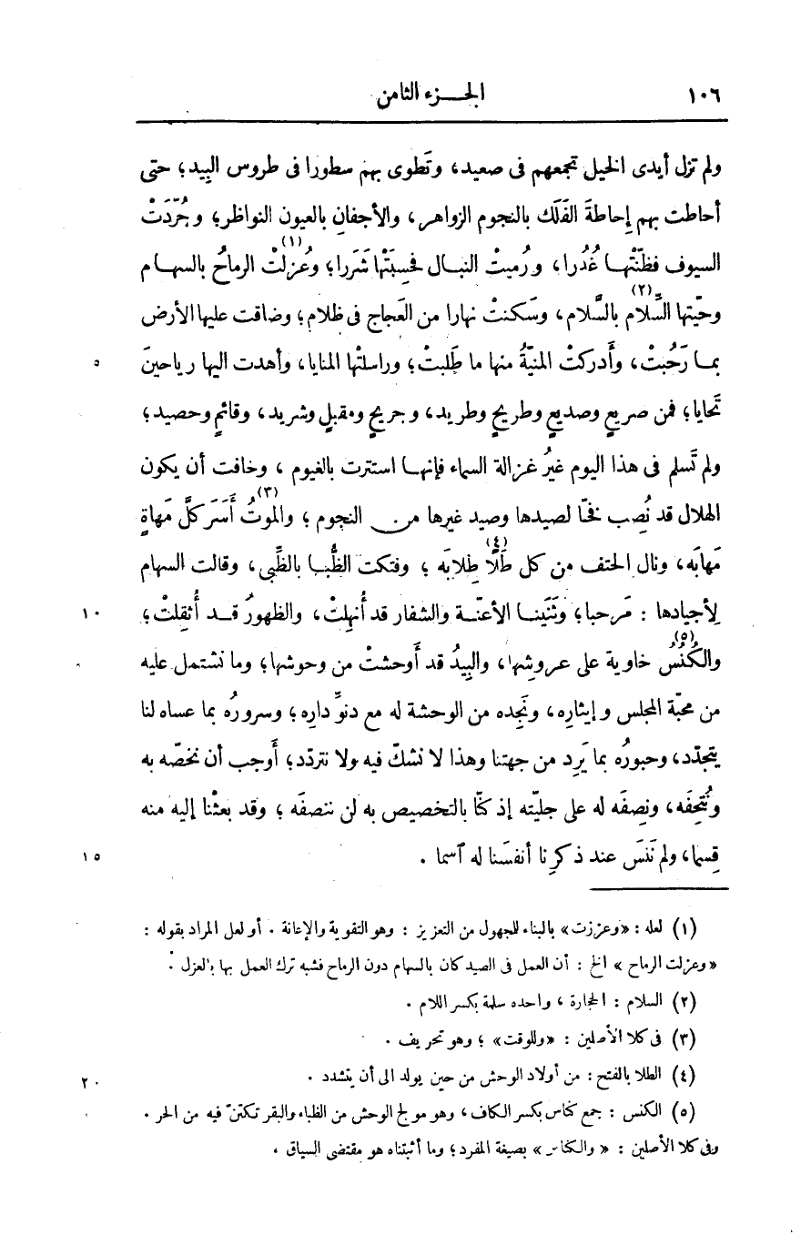 ولم تزل أيدى الخيل تجمعهم فى صعيد، وتطوى بهم سطورا فى طروس البيد؛ حتى أحاطت بهم إحاطة الفلك بالنجوم الزواهر، والأجفان بالعيون النواظر؛ وجرّدت السيوف فظنّتها غدرا، ورميت النبال فحسبتها شررا؛ وعزلت «1» الرماح بالسهام وحيّتها السّلام «2» بالسّلام، وسكنت نهارا من العجاج فى ظلام؛ وضاقت عليها الأرض بما ربحت، وأدركت المنيّة منها ما طلبت؛ وراسلتها المنايا، وأهدت اليها رياحين تحايا؛ فمن صريع وصديع وطريح وطريد، وجريح ومقبل وشريد، وقائم وحصيد؛ ولم تسلم فى هذا اليوم غير غزالة السماء فإنها استترت بالغيوم، وخافت أن يكون الهلال قد نصب فخّا لصيدها وصيد غيرها من النجوم؛ والموت «3» أسر كلّ مهاة مهابه، ونال الحتف من كل طلا «4» طلابه؛ وفتكت الظّبا بالظّبى، وقالت السهام لأجيادها: مرحبا؛ وثنينا الأعنّة والشفار قد أنهلت، والظهور قد أثقلت؛ والكنس «5» خاوية على عروشها، والبيد قد أوحشت من وحوشها؛ وما نشتمل عليه من محبّة المجلس وإيثاره، ونجده من الوحشة له مع دنوّ داره؛ وسروره بما عساه لنا يتجدّد، وحبوره بما يرد من جهتنا وهذا لا نشكّ فيه ولا نتردّد؛ أوجب أن نخصّه به ونتحفه، ونصفه له على جليّته إذ كنّا بالتخصيص به لن ننصفه؛ وقد بعثنا إليه منه قسما، ولم تنس عند ذكرنا أنفسنا له اسما.