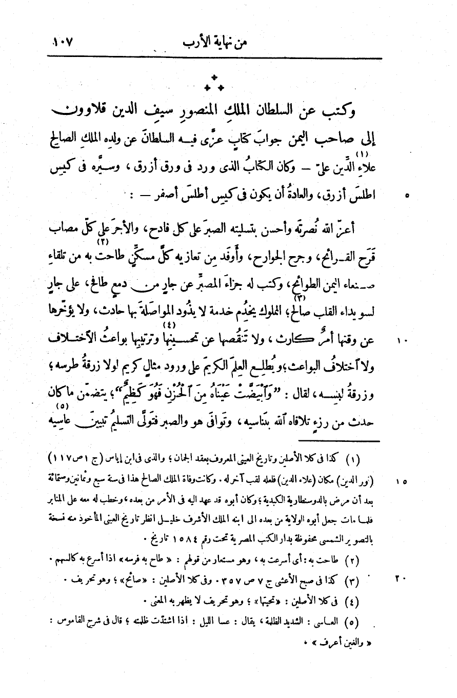 أعزّ الله نصرته وأحسن بتسليته الصبر على كل فادح، والأجر على كلّ مصاب قرح القرائح، وجرح الجوارح، وأوفد من تعازيه كلّ مسكّن طاحت «2» به من تلقاء صنعاء اليمن الطوائح، وكتب له جزاء المصبّر عن جار من دمع طافح، على جار لسويداء القلب صالح «3» ؛ المملوك يخدم خدمة لا يذود المواصلة بها حادث، ولا يؤخّرها عن وقتها أمر كارث، ولا تنقصها عن تحسينها «4» وترتيبها بواعث الاختلاف ولا اختلاف البواعث؛ ويطلع العلم الكريم على ورود مثال كريم لولا زرقة طرسه؛ وزرقة لبسه، لقال: «وابيضّت عيناه من الحزن فهو كظيم» ؛ يتضمّن ما كان حدث من رزء تلافاه الله بناسيه، وتوافى هو والصبر فتولّى التسليم تبيين عاسيه «5»